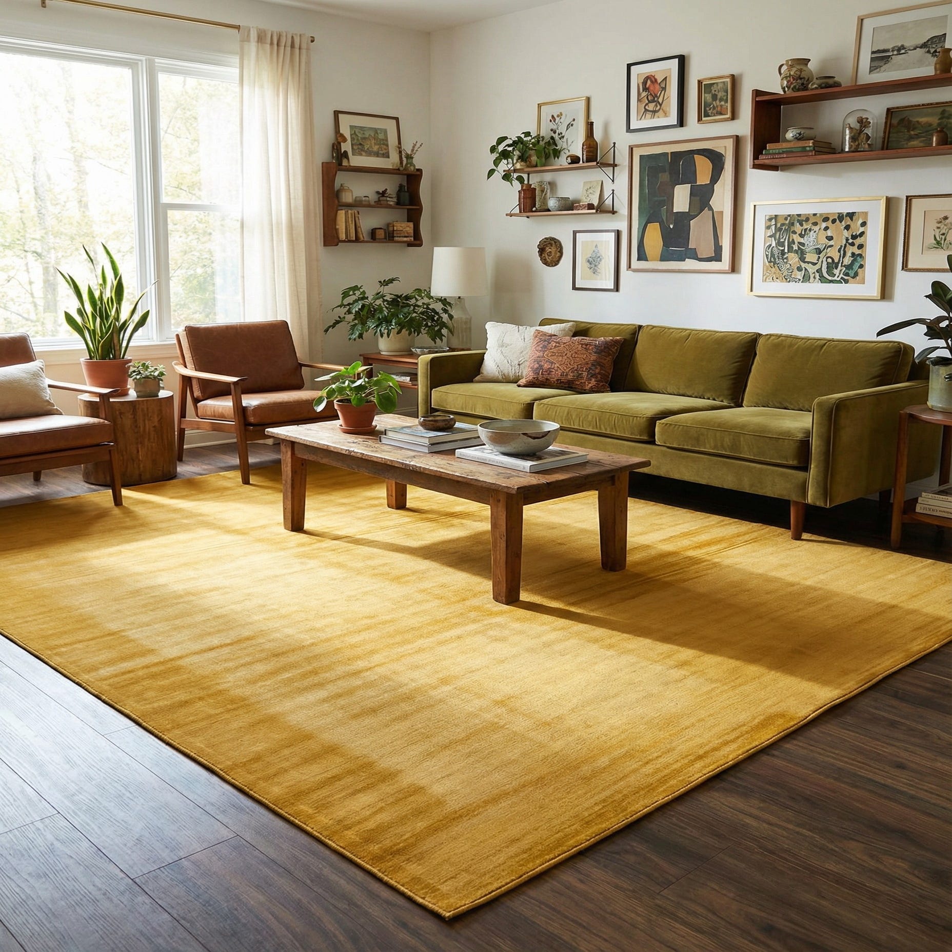 The SoHo Collection offers a contemporary rug with a rich gold background that embodies simplicity and sophistication. This 10x13 rug is machine woven of 100% polypropylene, designed for durability and longevity in high-traffic areas. The monochromatic gold hue presents a versatile color that can easily integrate into a variety of interior design themes.