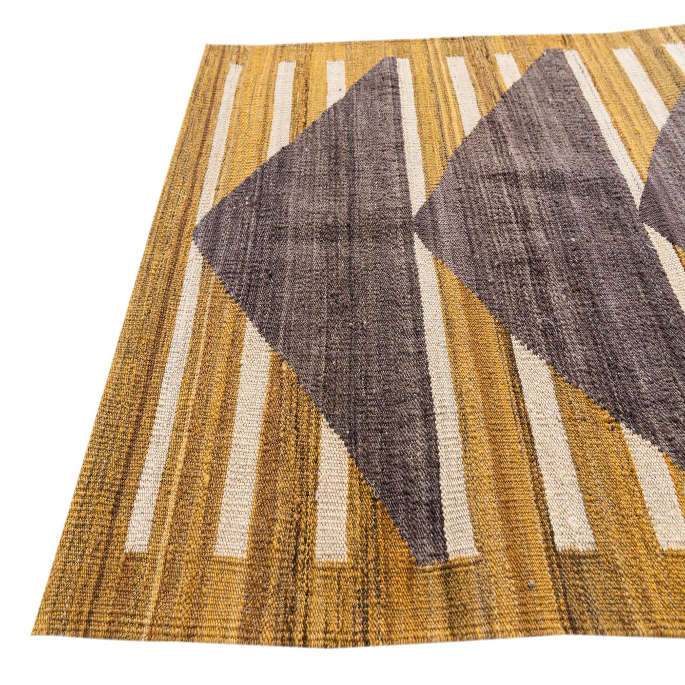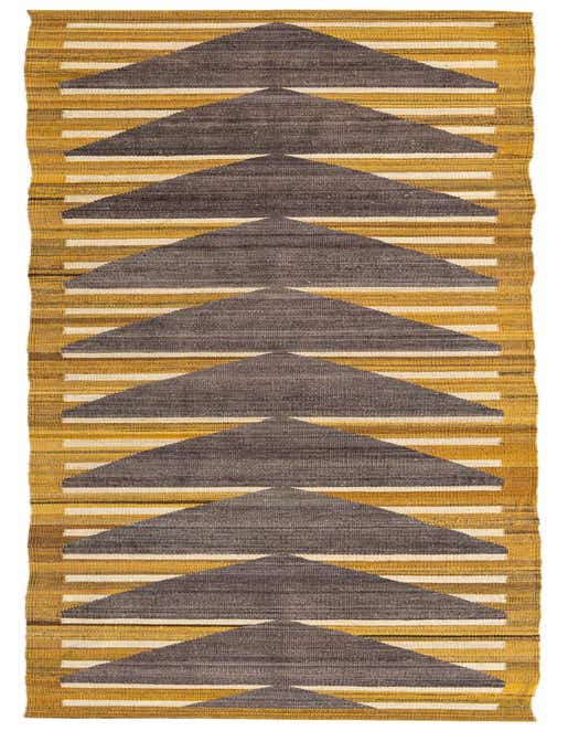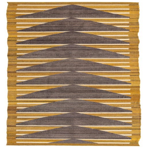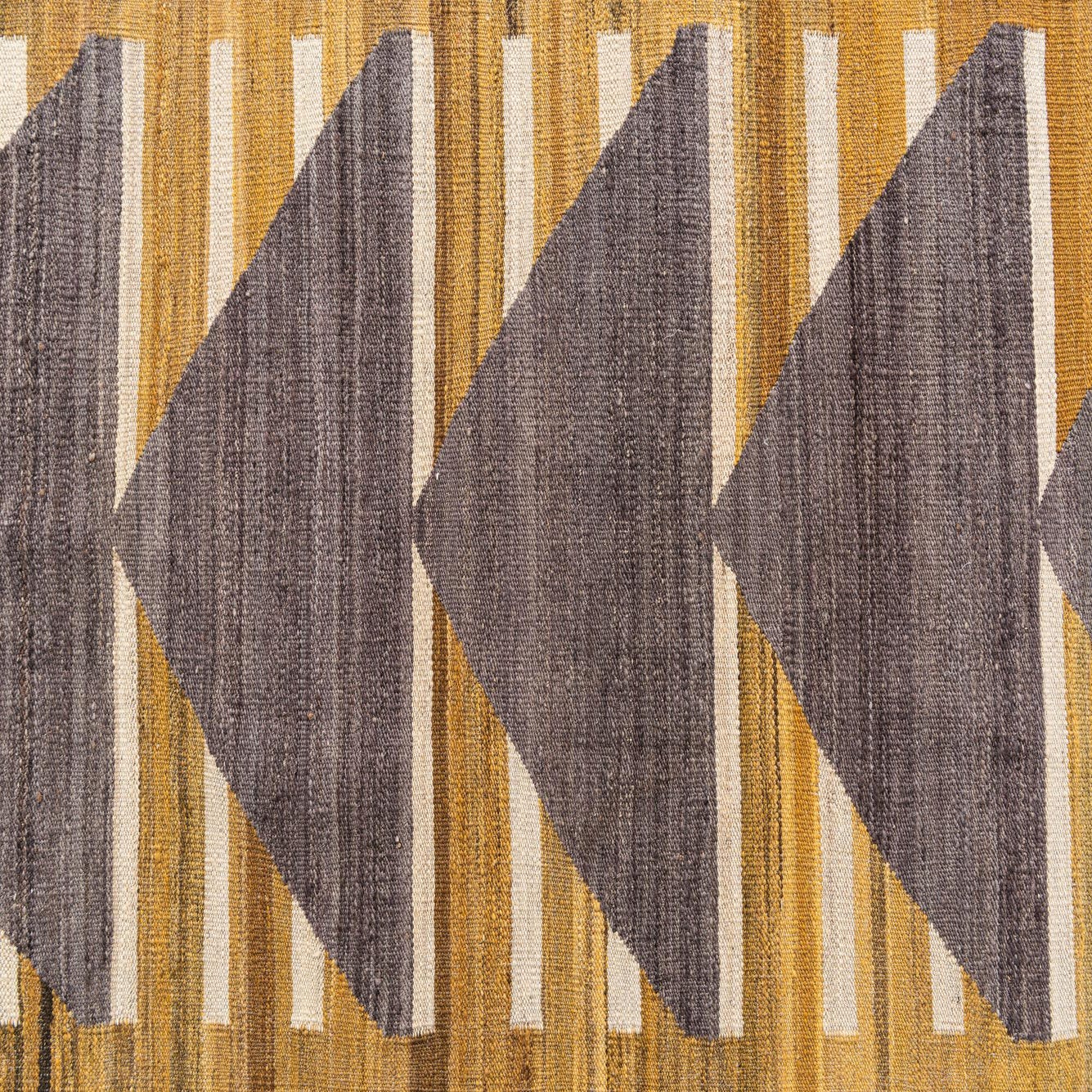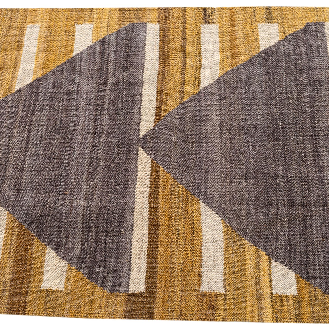 The Kilim Modern collection presents a hand-woven 11 ft runner that gracefully combines traditional techniques with contemporary design. This piece showcases an array of geometric patterns that draw the eye, featuring a sequence of bold, dark gray triangular motifs that punctuate the golden background. Paler stripes in varying shades of gray and brown intermingle, providing additional depth and texture.