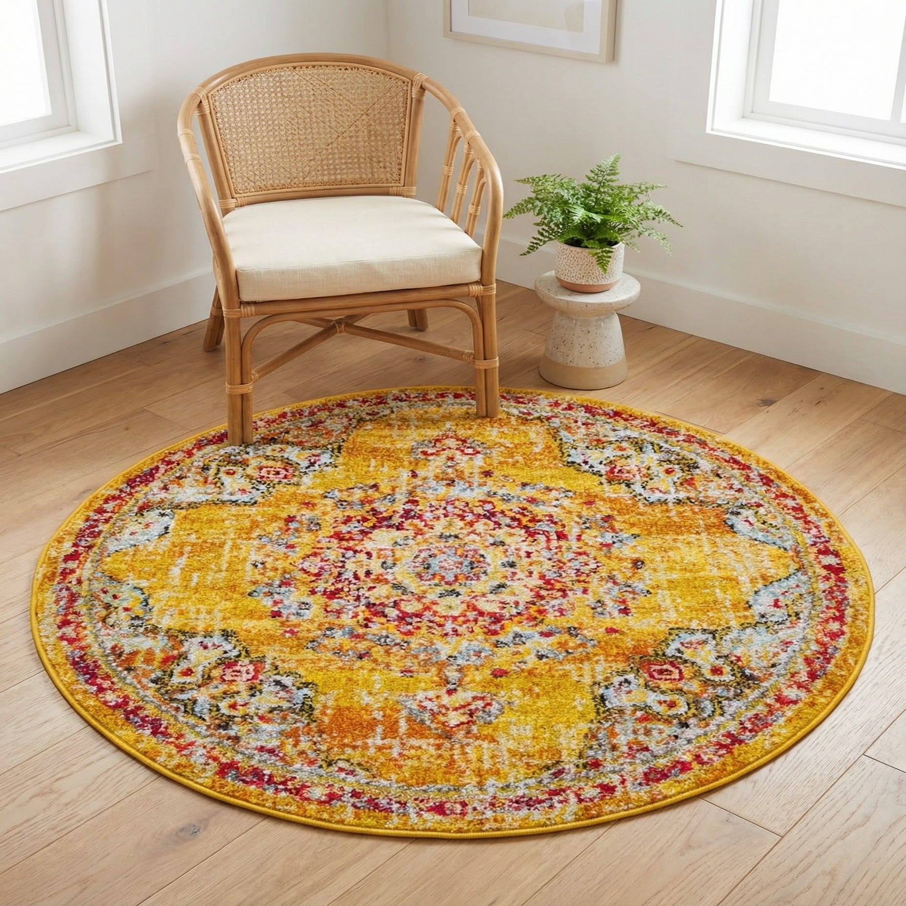 Machine-made from 100% polypropylene, the rug has a low, dense pile that feels smooth underfoot and holds its shape in everyday spaces. Its vibrant gold ground and multicolor detailing work well as a bright accent in a small dining nook or beneath a bistro table, as an anchor for a cozy reading corner, or layered over a neutral larger rug in a living room. The pattern and palette complement eclectic, bohemian, and modern farmhouse interiors, and they add a warm, energetic touch to transitional schemes.