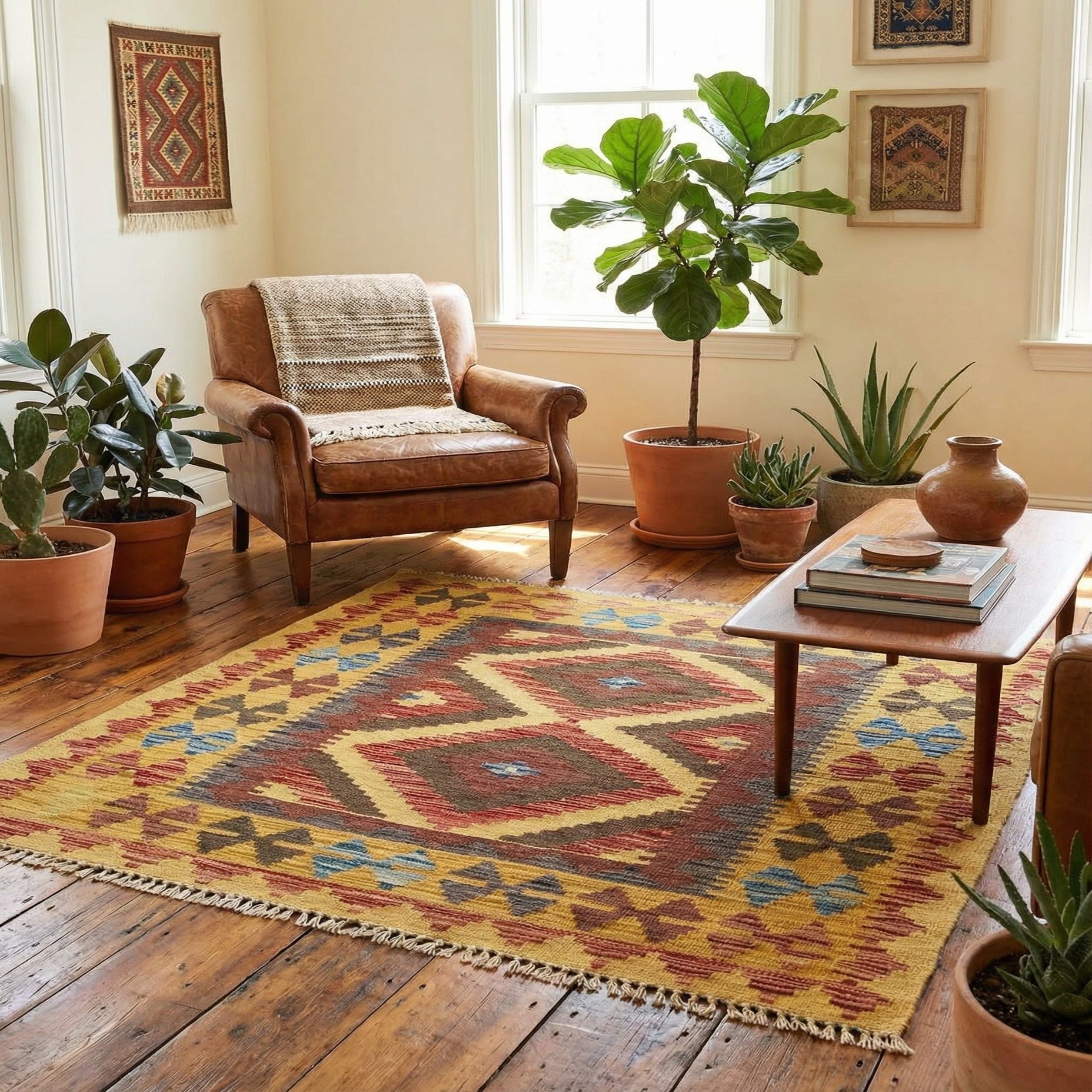 A square 3' 2 x 3' 5 Kilim Maymana wool rug featuring a Southwestern tribal medallion pattern in yellows, golds, reds, and blues.