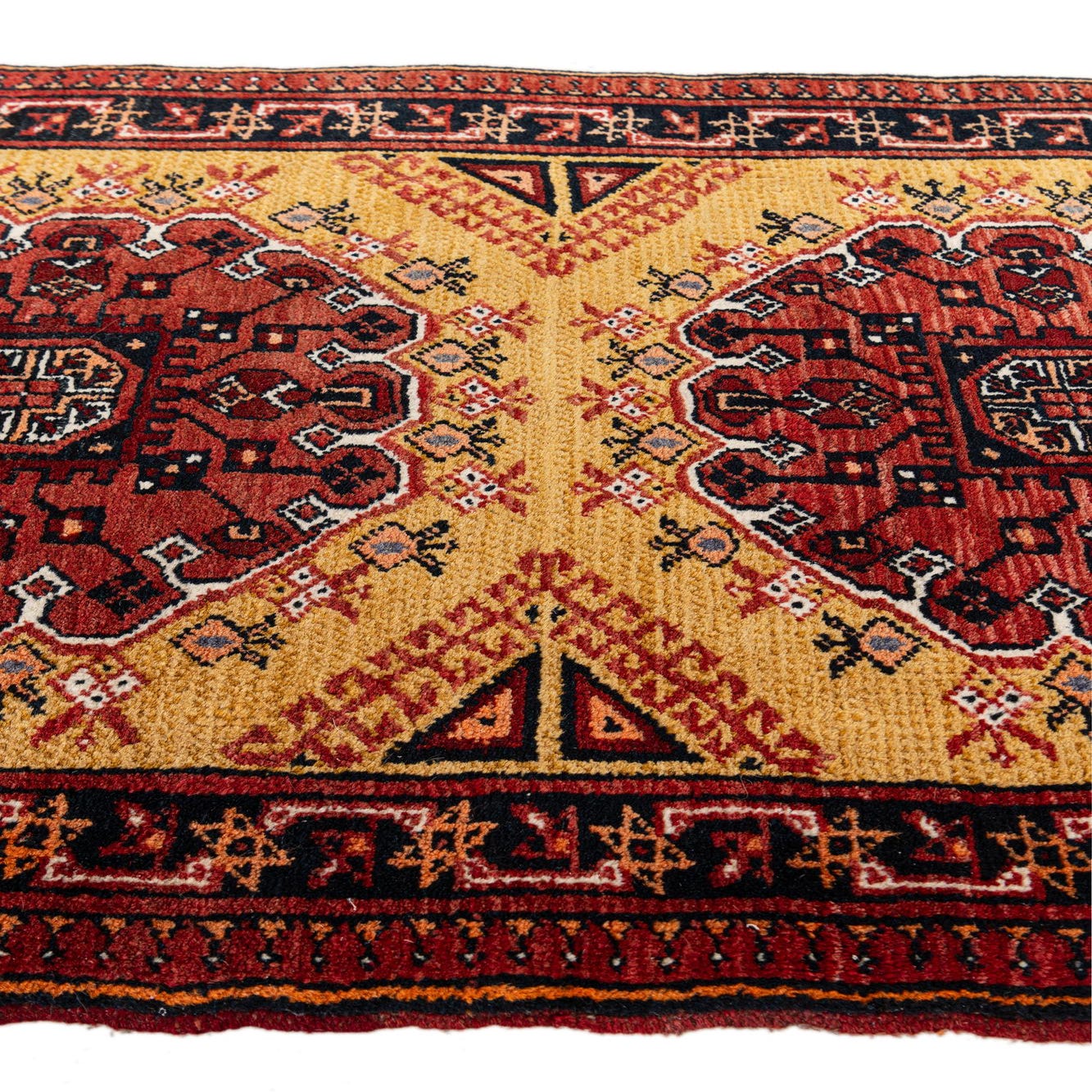 Primary color is Gold. Colors in this rug include: Gold, Black, Brown, Orange, Red, Rust Red.