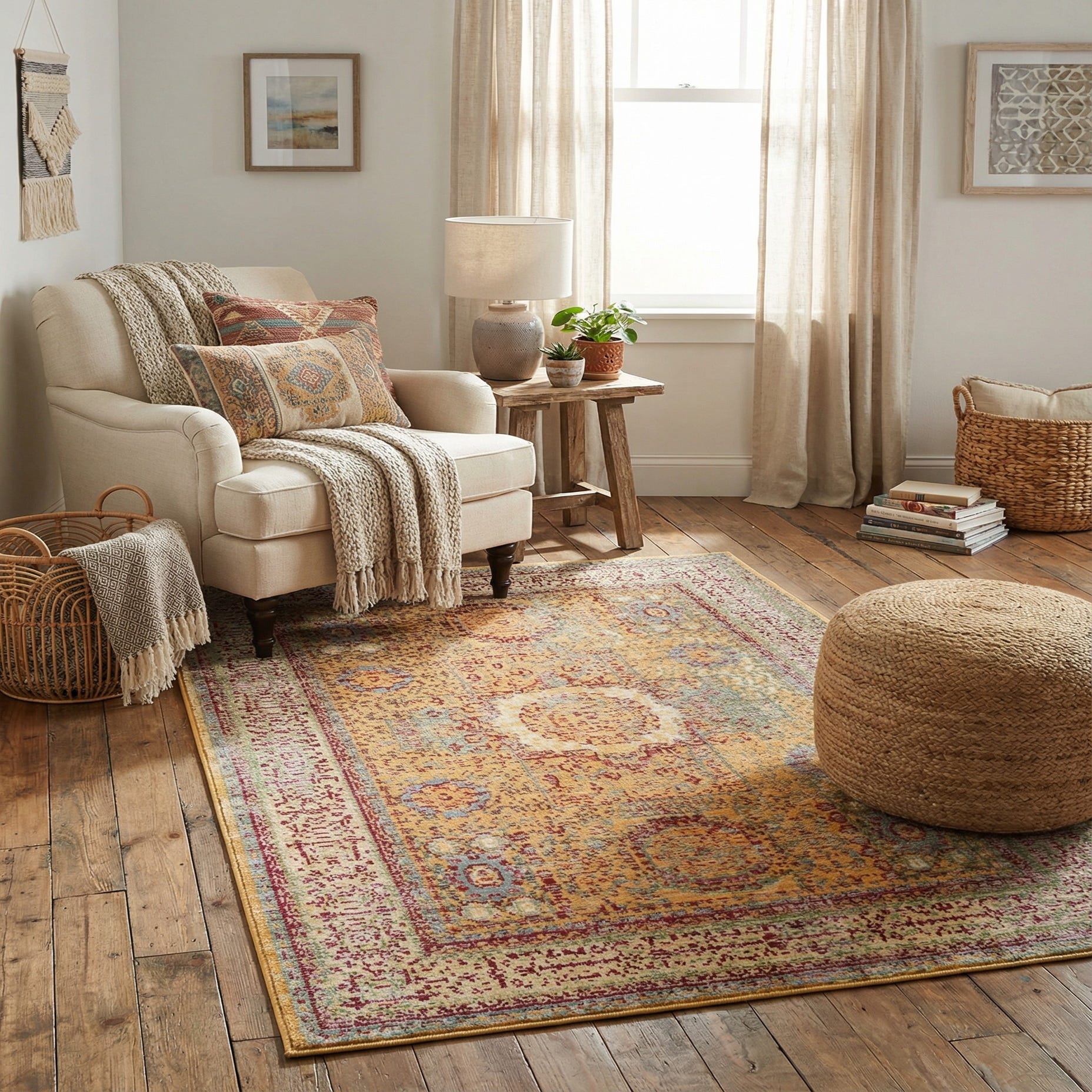 Machine-made from 100% polyester, the rug has a low, smooth pile with a soft hand and a subtle shimmer that catches light without overwhelming the pattern. This piece works well in smaller seating areas, an entry or layered at the foot of a bed; pair it with warm wood furniture and brass or aged-metal accents for a cohesive palette, or introduce muted blues and ivory textiles for a fresher, transitional scheme. It also complements eclectic, boho and traditional interiors where a touch of color and pattern helps anchor the room.
