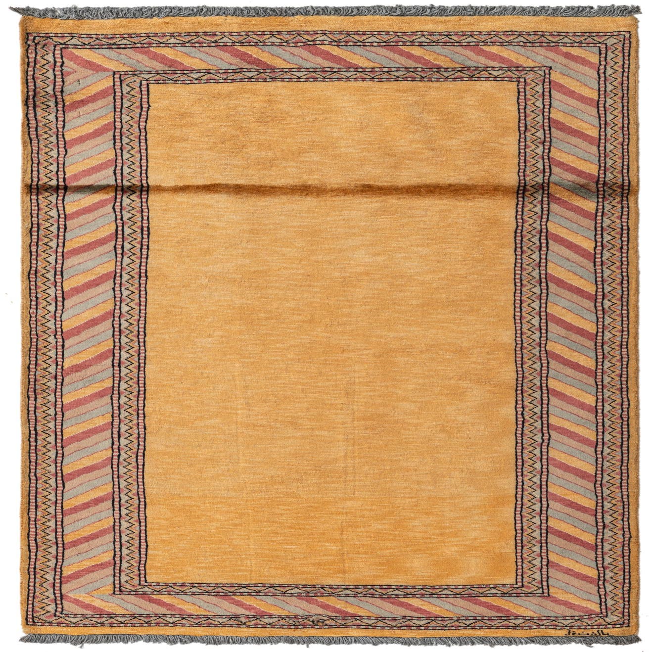 A 3x5 rectangular yellow Kashkuli Gabbeh wool rug with a modern oriental striped border in red, gray, and gold.