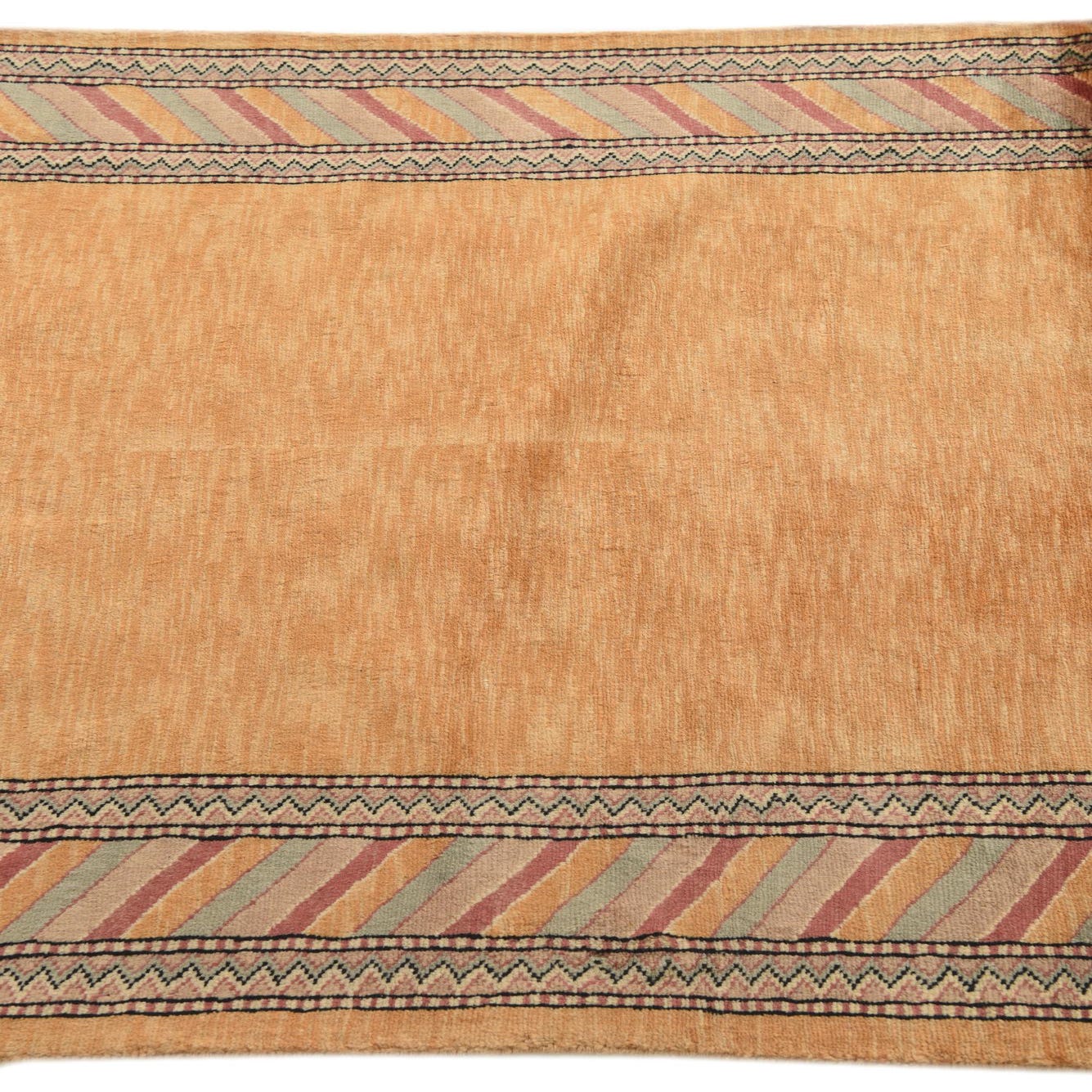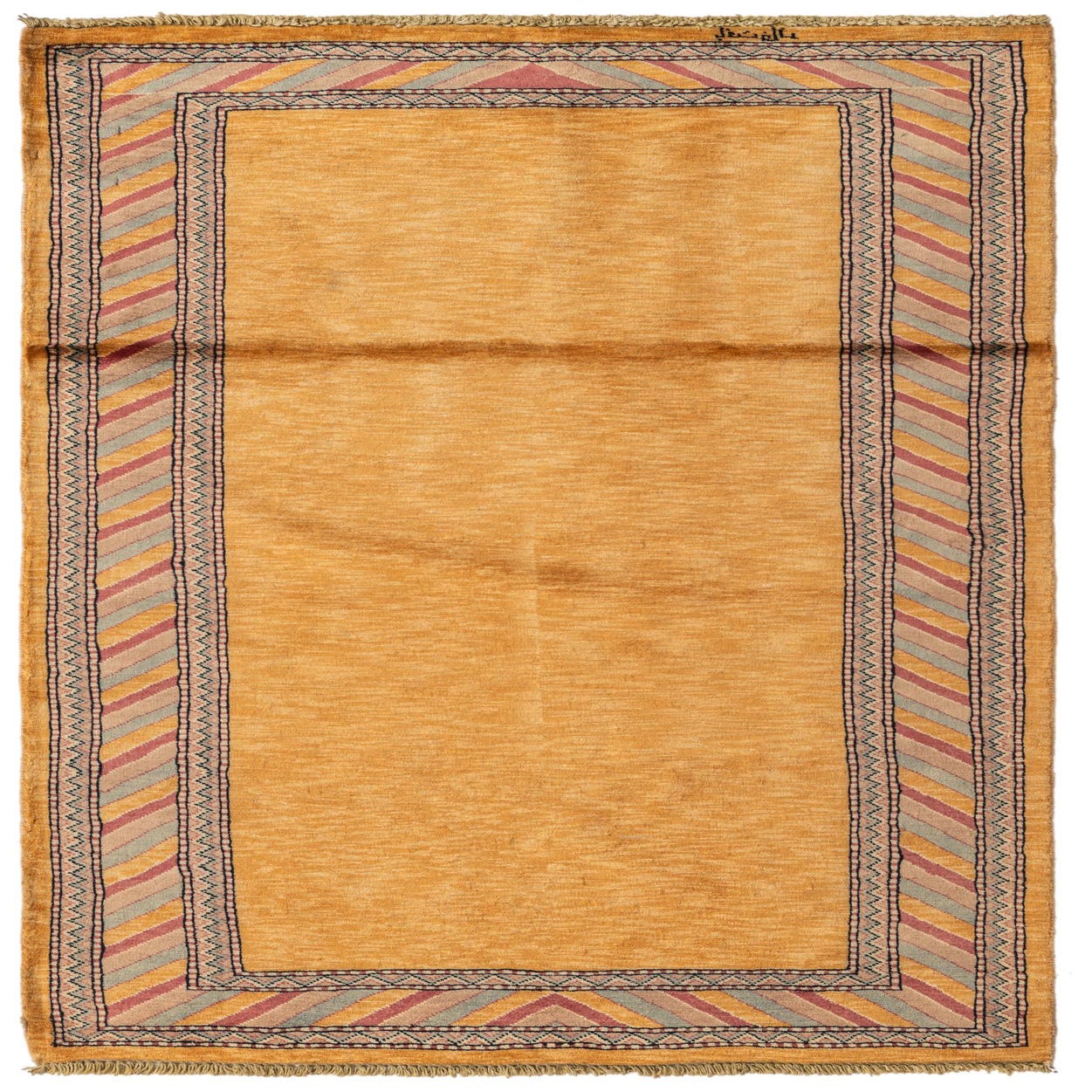 A 3x5 rectangular yellow Kashkuli Gabbeh rug with a modern oriental border featuring red, pink, and blue stripes.