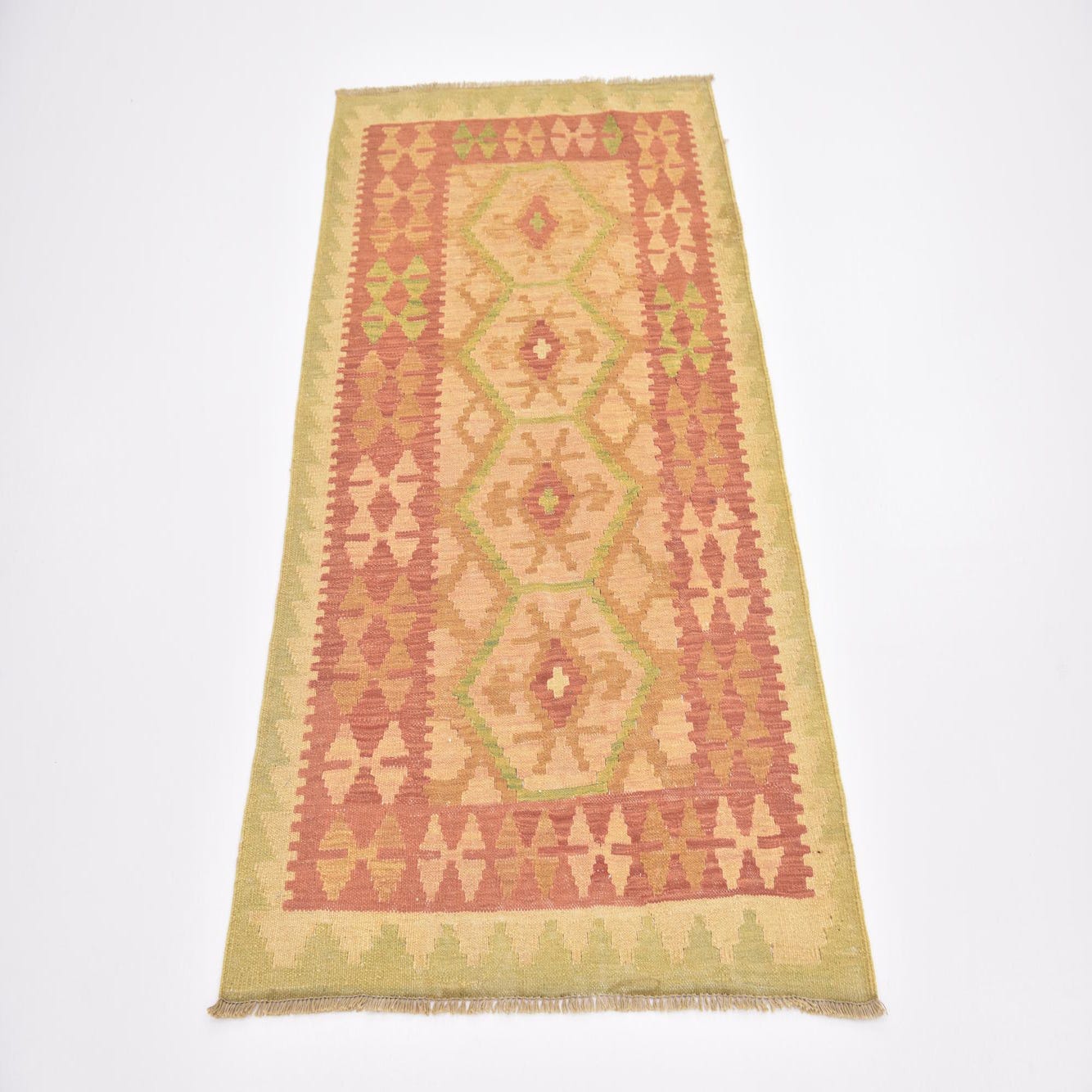 The Kilim Waziri collection presents a 3x5 hand-woven rug that showcases a harmonious blend of traditional Kilim design with a contemporary color palette. Expertly crafted of 100% wool, this rug features a gold background accented by a vibrant array of colors including light blue, light green, orange, and rust red, which come together to form geometric and diamond-shaped patterns synonymous with Kilim style. Finished with fringe edges that add to its authentic appeal, the rug delivers both visual interest and a tactile experience underfoot.