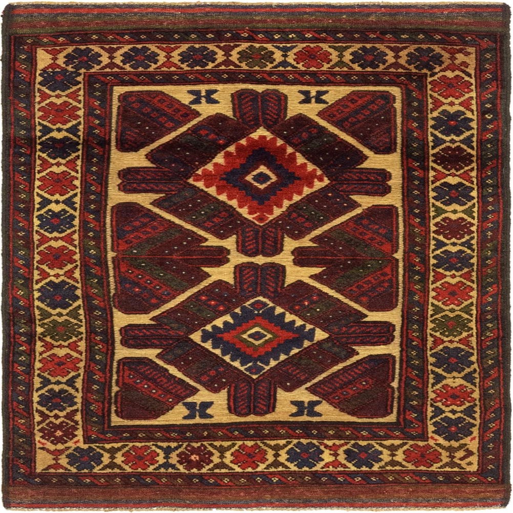 The Sumak collection presents a 3x5 hand-knotted rug that seamlessly blends traditional craftsmanship with a compelling design. The pattern of this rug incorporates a series of geometric motifs and tribal-inspired elements, creating an engaging visual tapestry that draws the eye. Rich colors such as gold, beige, black, brown, green, red, maroon, and olive interact harmoniously against the dominant gold background, offering an inviting warmth and complexity.