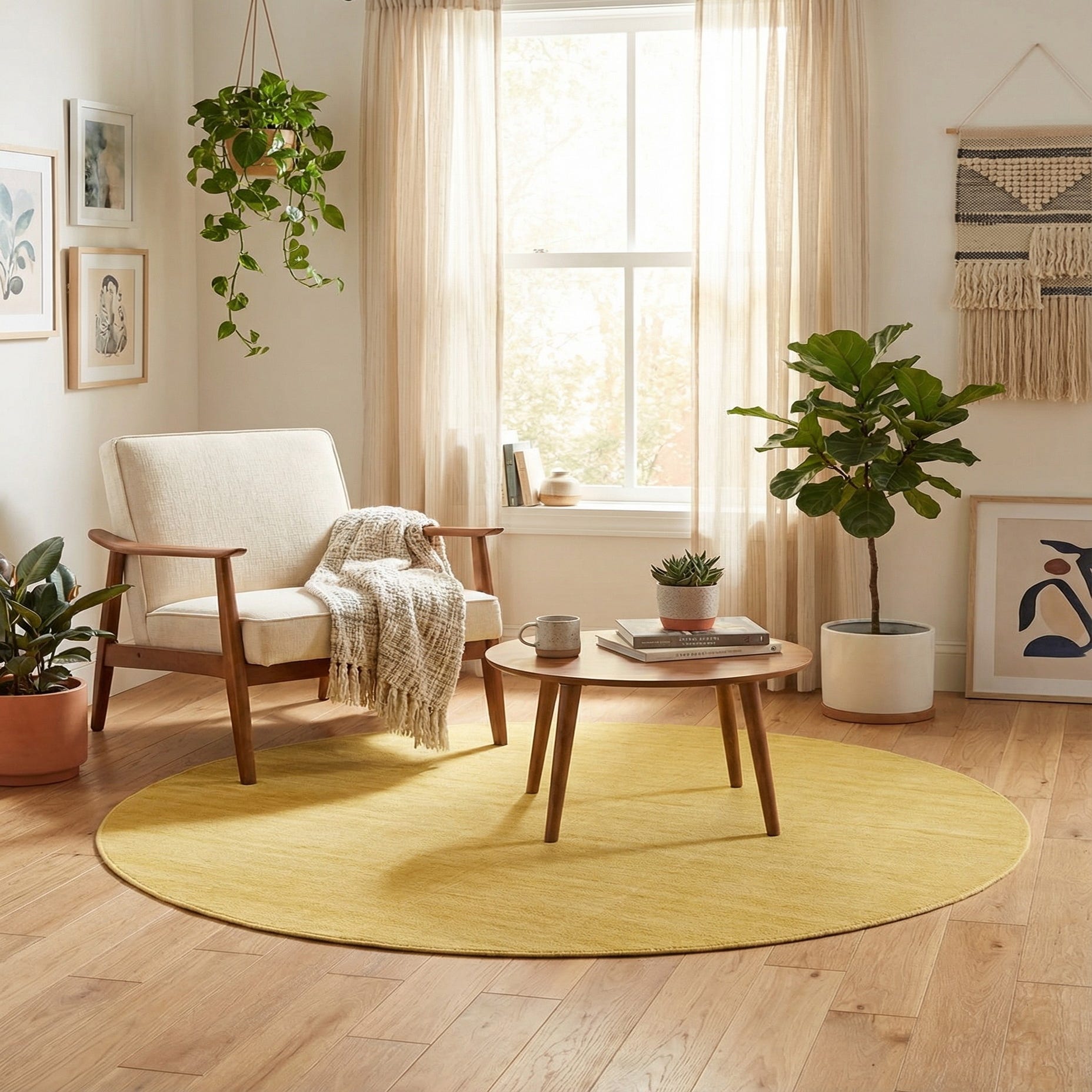 A 3' 7 x 3' 7 round yellow SoHo rug made of polypropylene, featuring a flat pile and solid urban design.