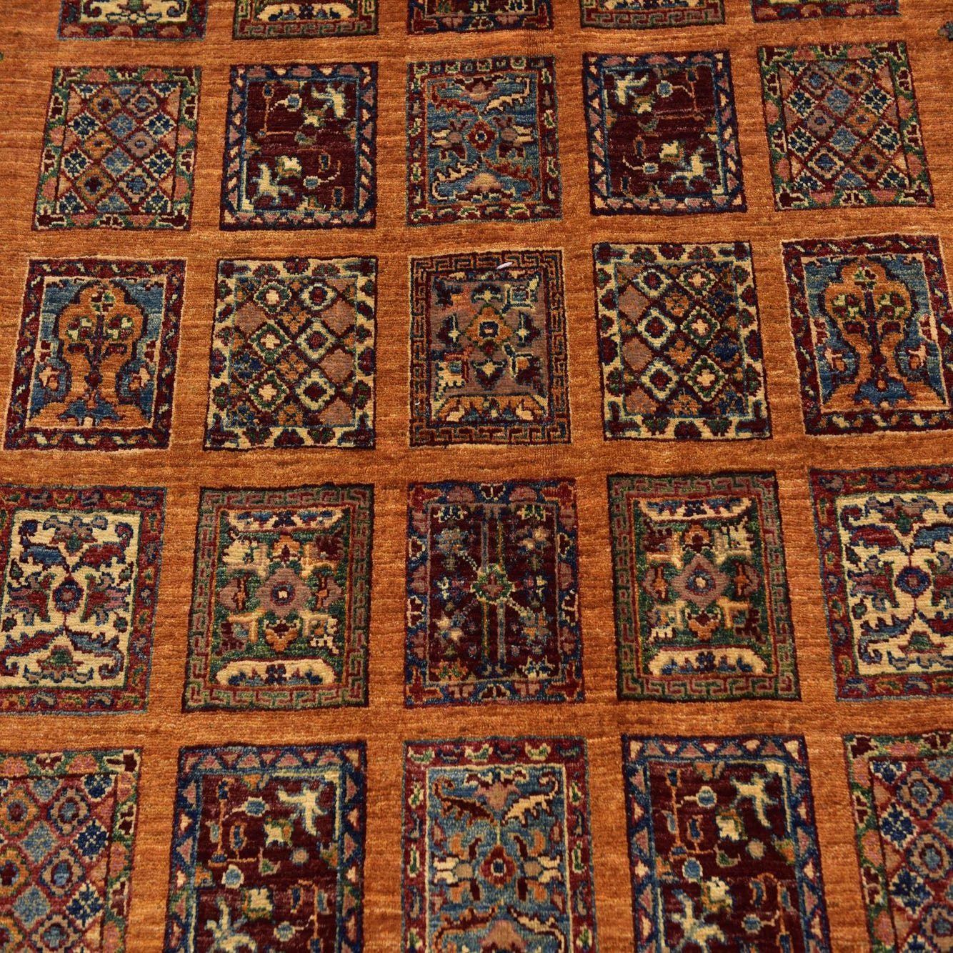 The rug features a grid of varied, detailed motifs, creating a tapestry of traditional patterns imbued with a modern sensibility. The dominant gold hue provides a warm base, inviting the rich blues, subtle peaches, and vibrant greens to stand out. The decorative border frames the canvas with finesse, and the fringe adds a classic finish to the rug's perimeter.
