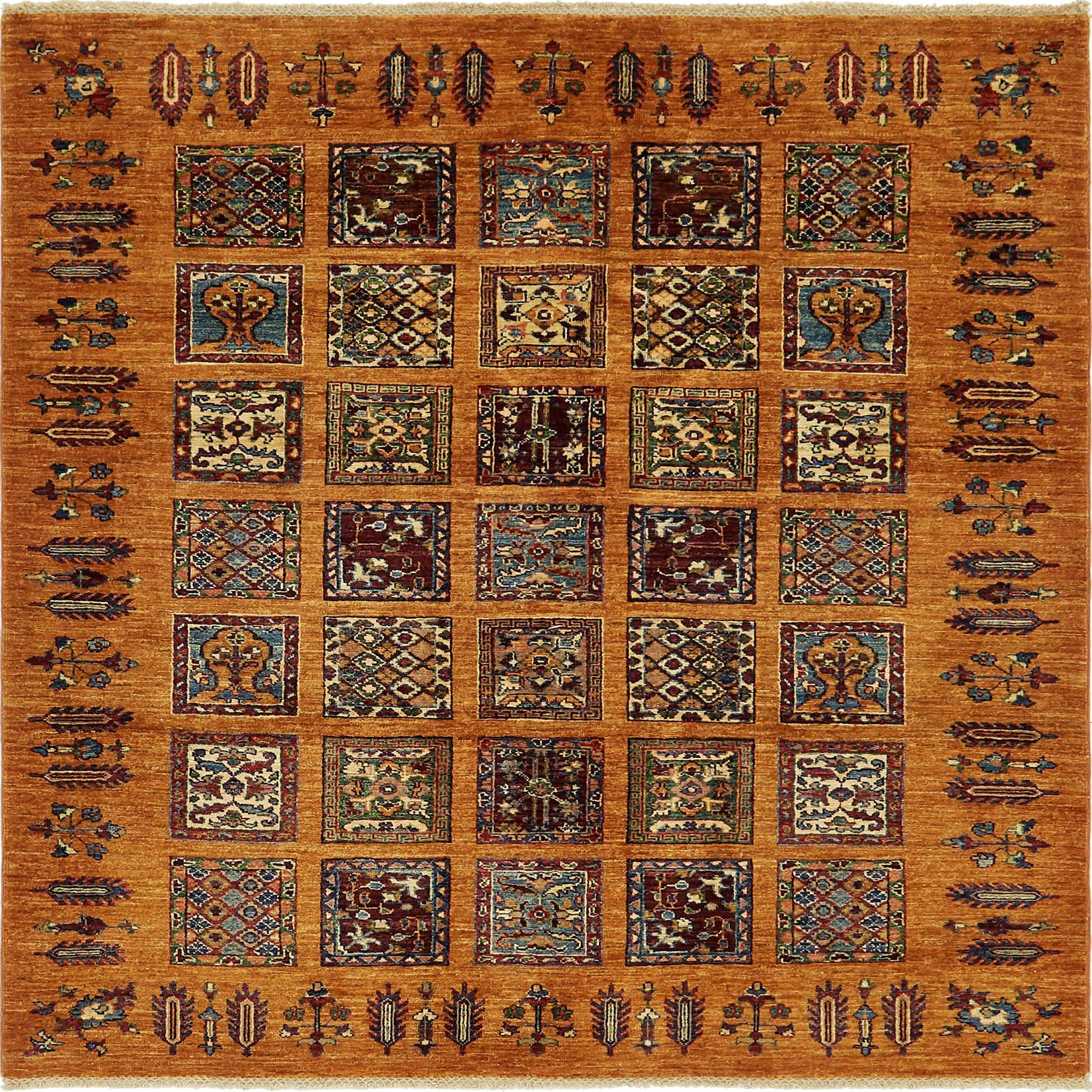 The Ariana Ziegler collection presents a meticulously hand-knotted rug, crafted from 100% hand-spun wool offering durability and a tactile experience underfoot. This 4x6 piece showcases a robust gold background complemented by a harmonious palette that includes gold, blue, cream, green, navy blue, peach, red, and olive. Each color is thoughtfully positioned to accentuate the intricate patterns within the design.