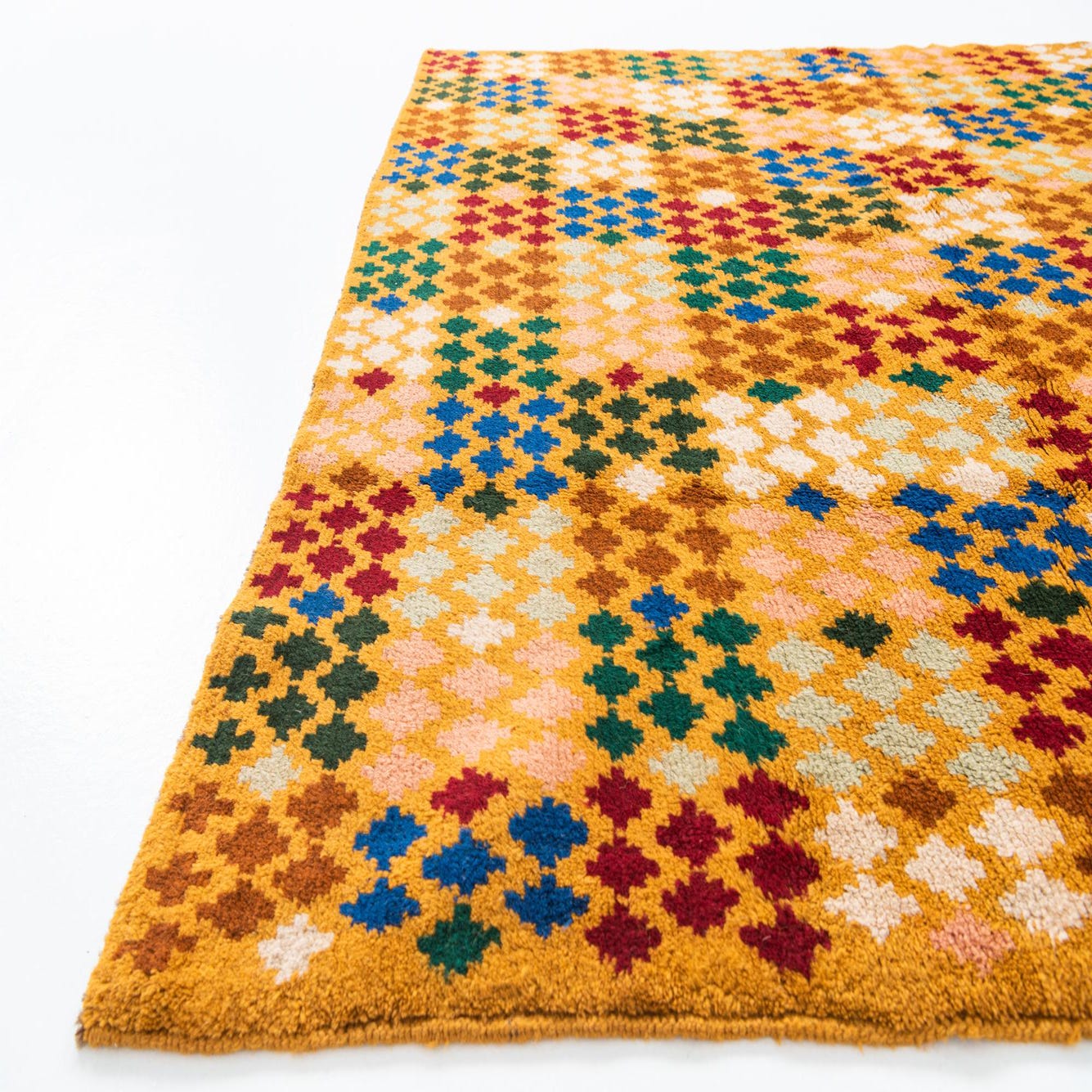 A 4x6 rectangular Balouch rug in yellow, featuring a traditional tribal pattern of colorful diamonds in blues, reds, greens, and browns.
