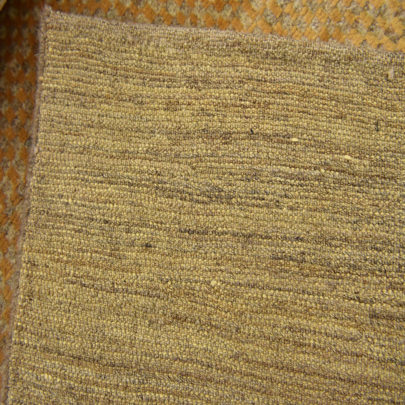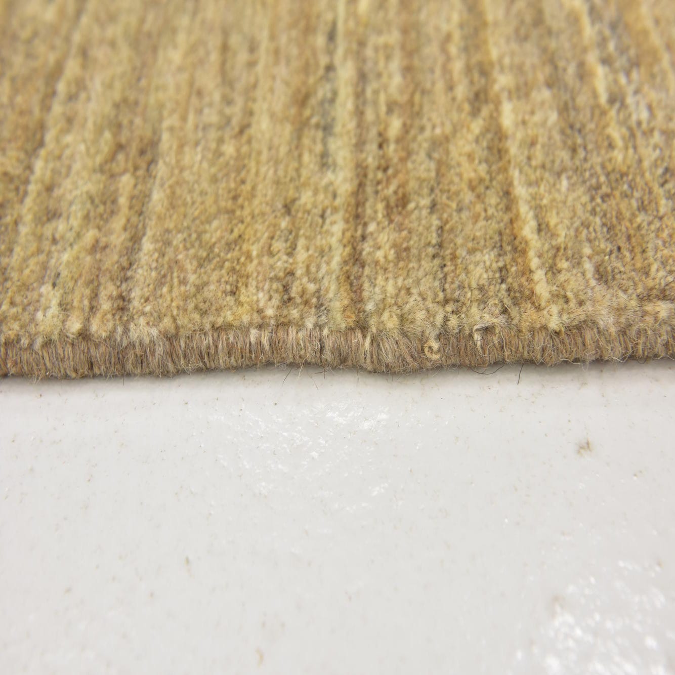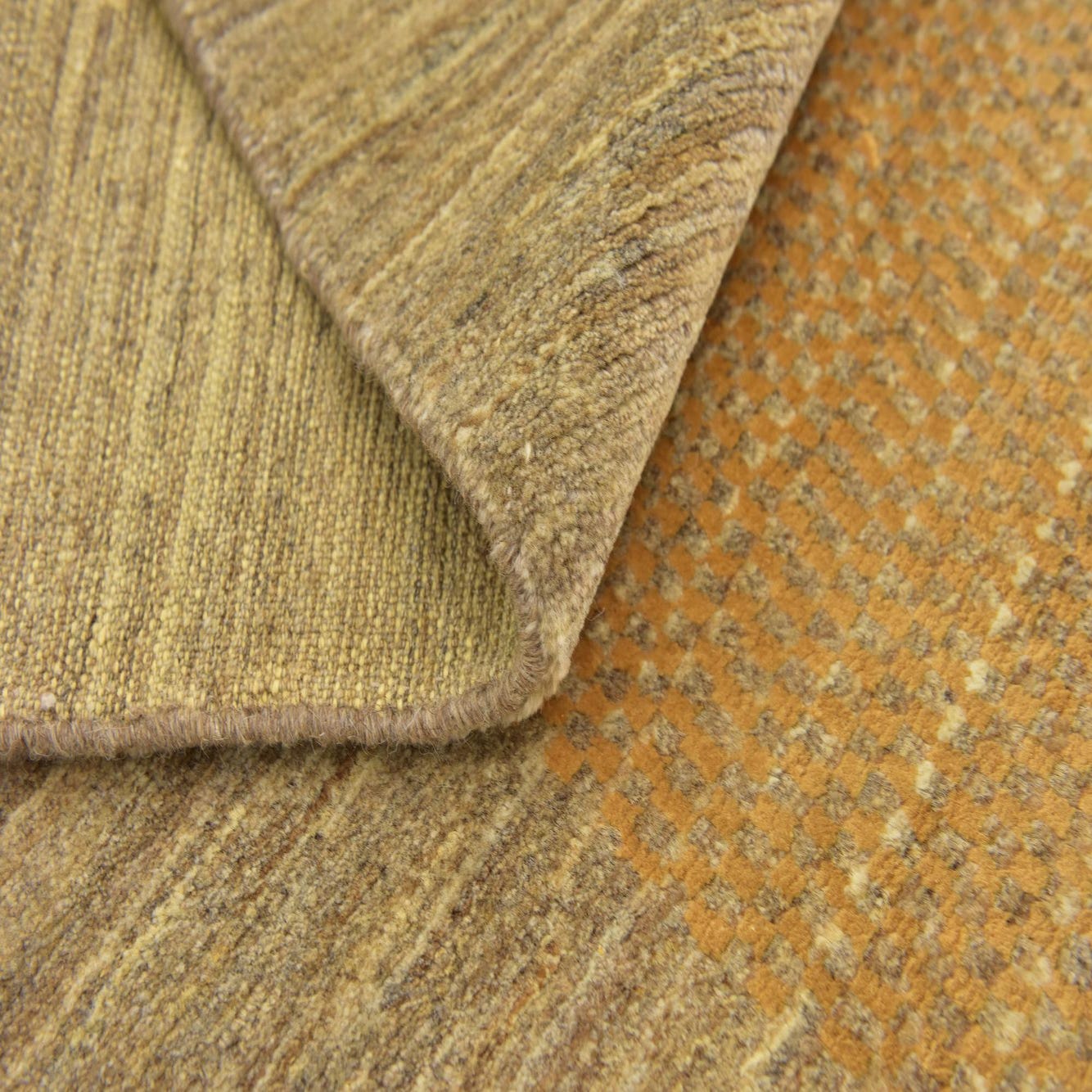 A warm gold field forms the backdrop for a subtle all-over pattern of small geometric knots in cream and beige, creating a quiet, honeyed texture that rewards a closer look. A broad, striated beige border frames the center, its natural color variation adding an organic, handcrafted quality. Hand-knotted, 100% wool construction gives the surface a low-to-medium pile with a soft, slightly dense feel underfoot and gentle tactile variation from the knotting.