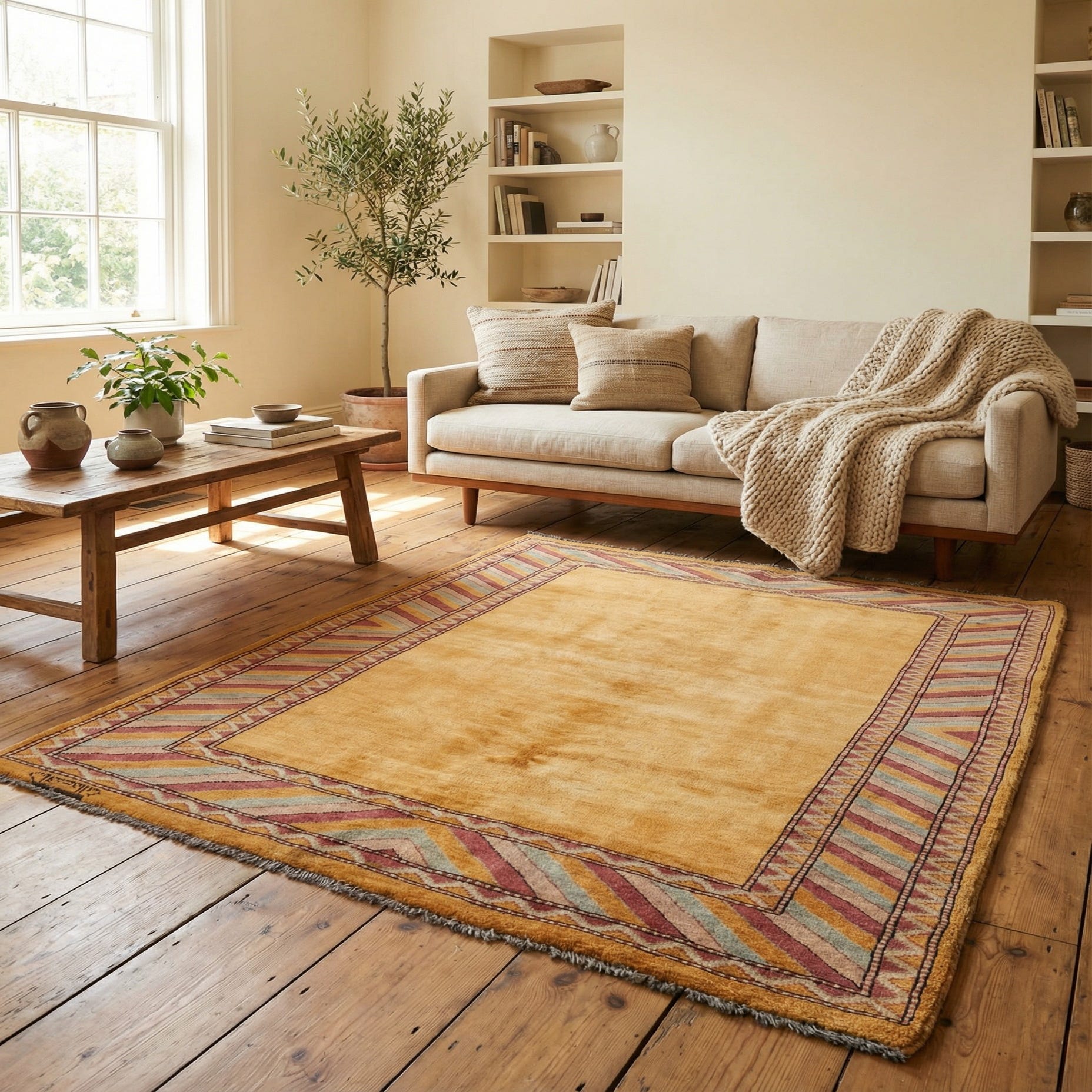 The Kashkuli Gabbeh collection offers a 4x6 hand-knotted rug crafted from 100% wool, presenting durability and a tactile experience underfoot. This rug features a plush gold background, complemented by a border pattern that includes black, light blue, and red hues, adding visual interest and a vibrant contrast to the overall design. The border showcases a series of geometric motifs and lines, evocative of traditional craftsmanship.