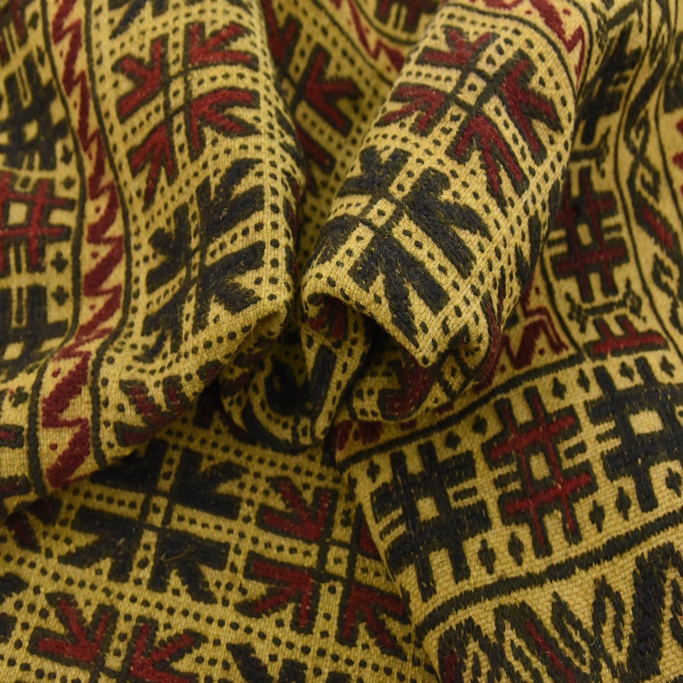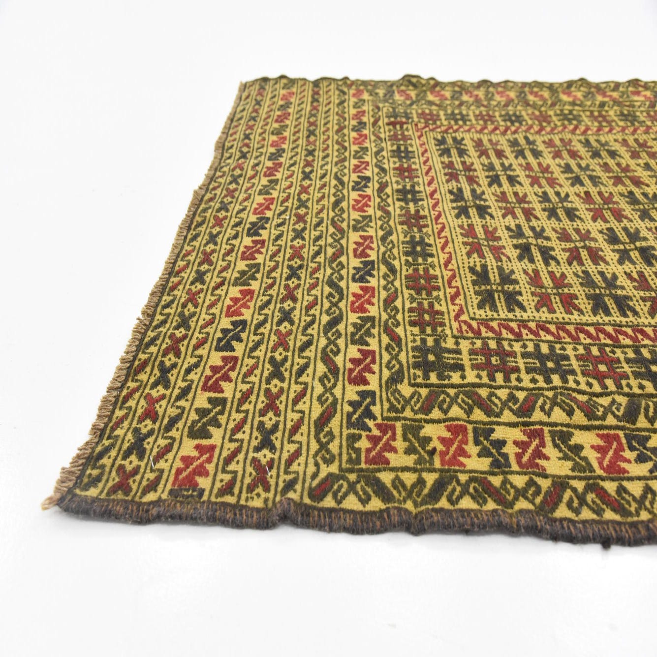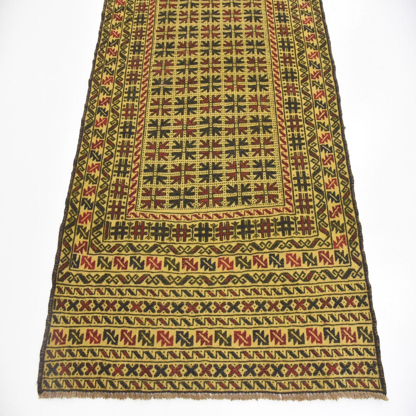 A 4x6 rectangular Kilim Afghan rug with a tribal, oriental pattern in yellows, golds, black, and red.