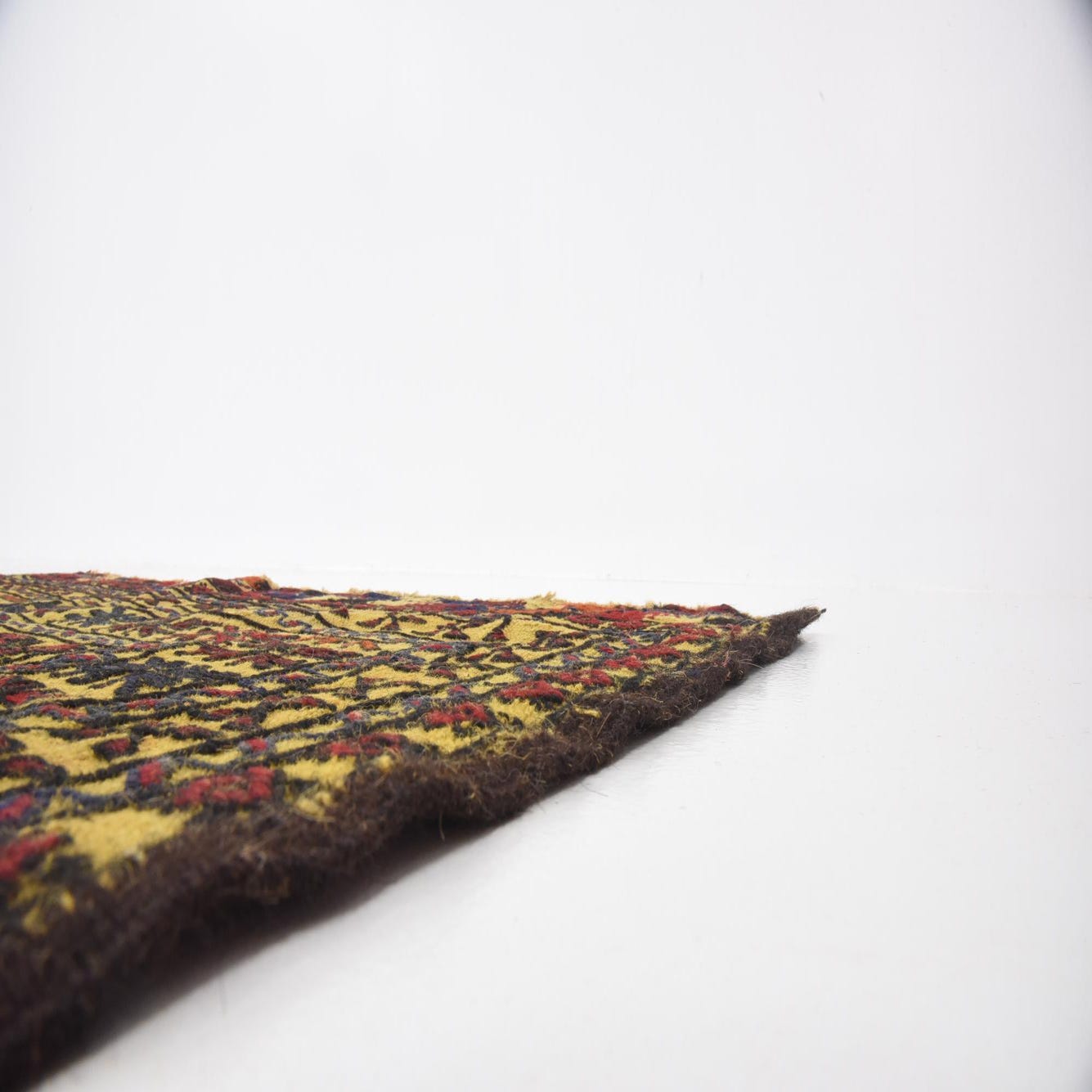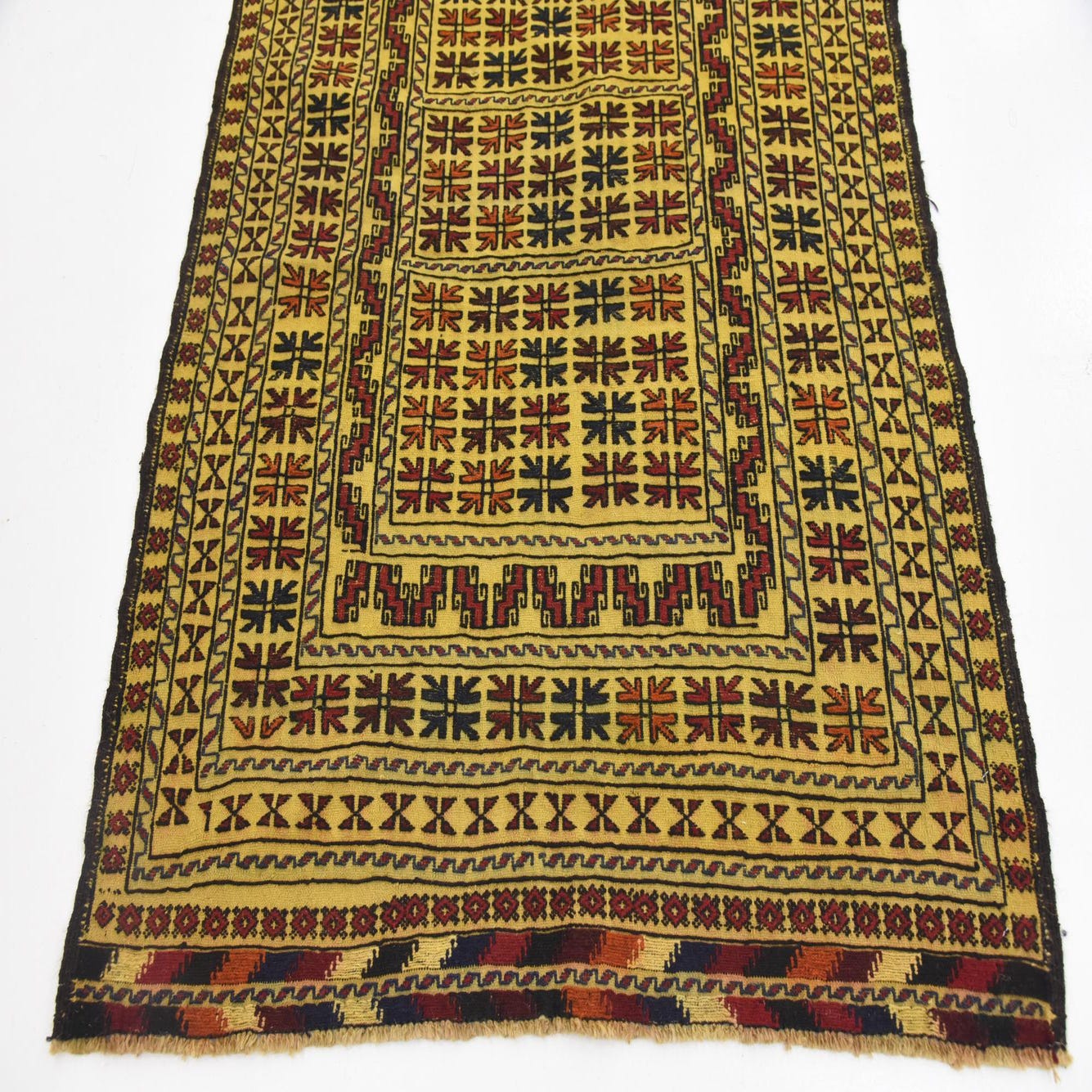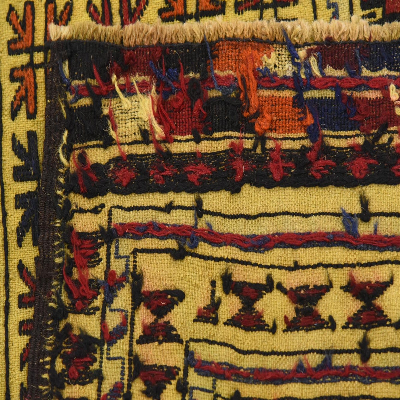 A 4x6 rectangular Kilim Afghan rug with a yellow field and intricate tribal patterns in red, navy, and gold.