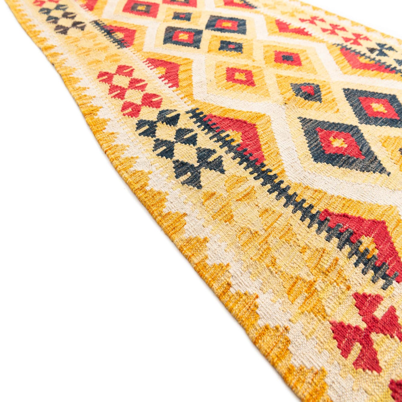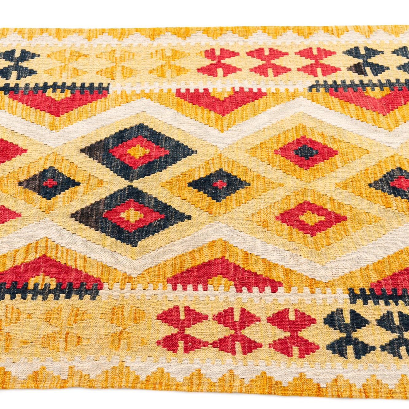 A 4x6 rectangular Kilim Maymana rug with a Southwestern tribal pattern in yellow, gold, red, and dark blue.