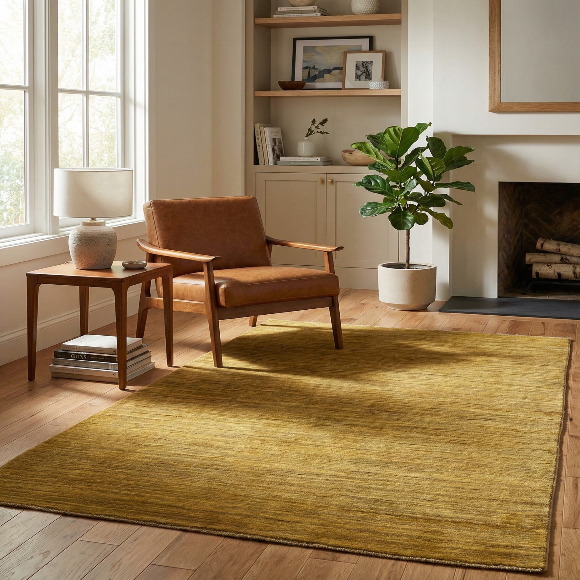 A 4x6 rectangular Modern Ziegler rug in varying shades of gold and yellow with a subtle horizontal striped pattern, suitable for a living room.