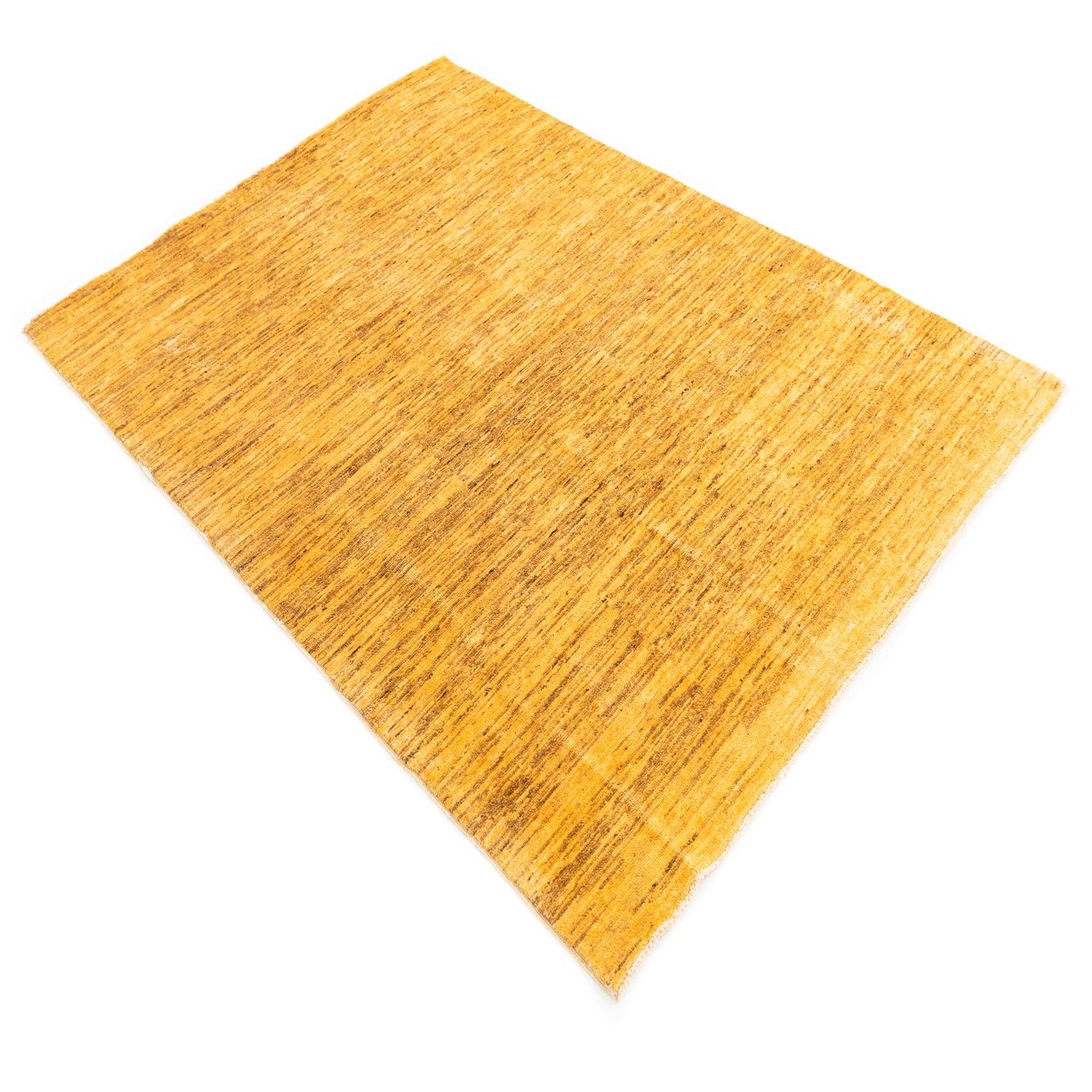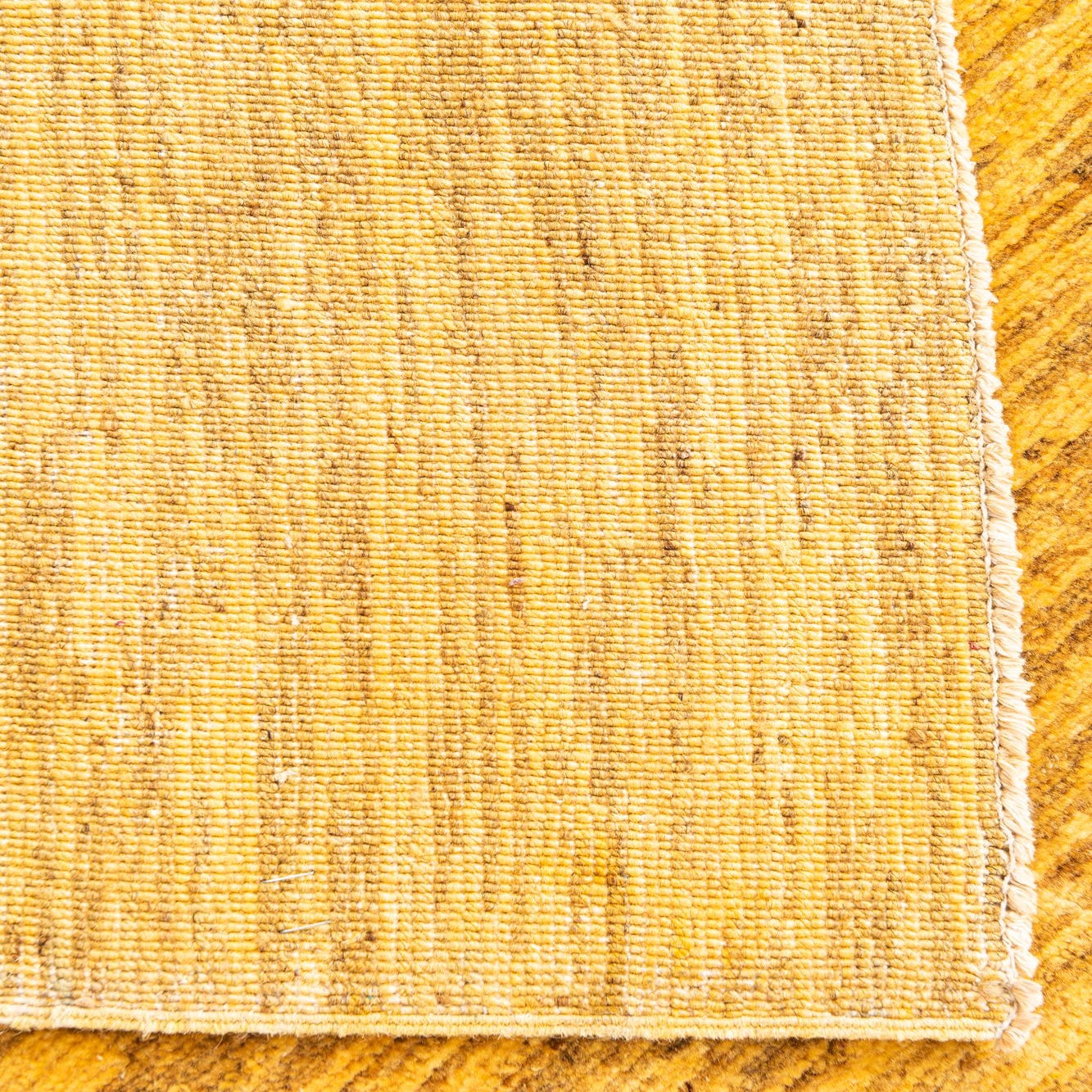 Hand-knotted of 100% hand-spun wool, this rug presents a warm gold field threaded with brown and tan striations for a quietly textured look. The design is understated and linear, with closely spaced horizontal bands that create a gentle, mottled surface rather than a sharply defined pattern. The hand-spun wool yields slight variation in the yarn and a soft, low pile that feels warm and tactile underfoot while catching light to emphasize the depth of the gold and brown tones.