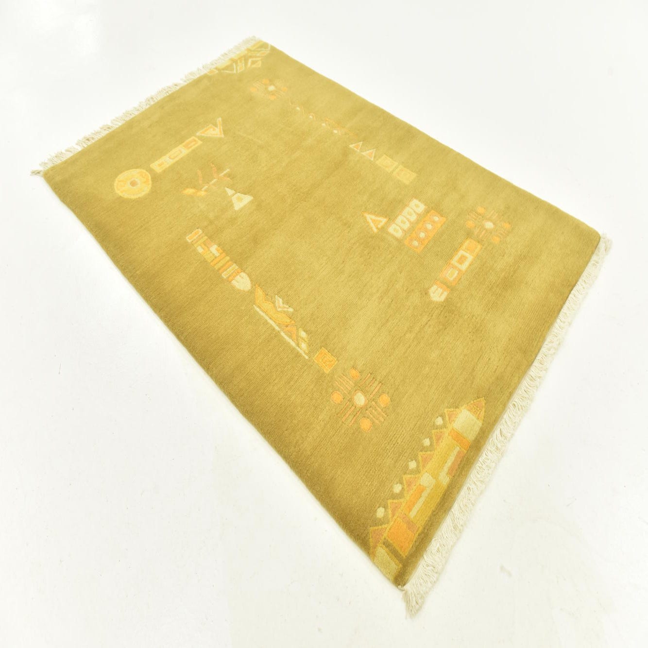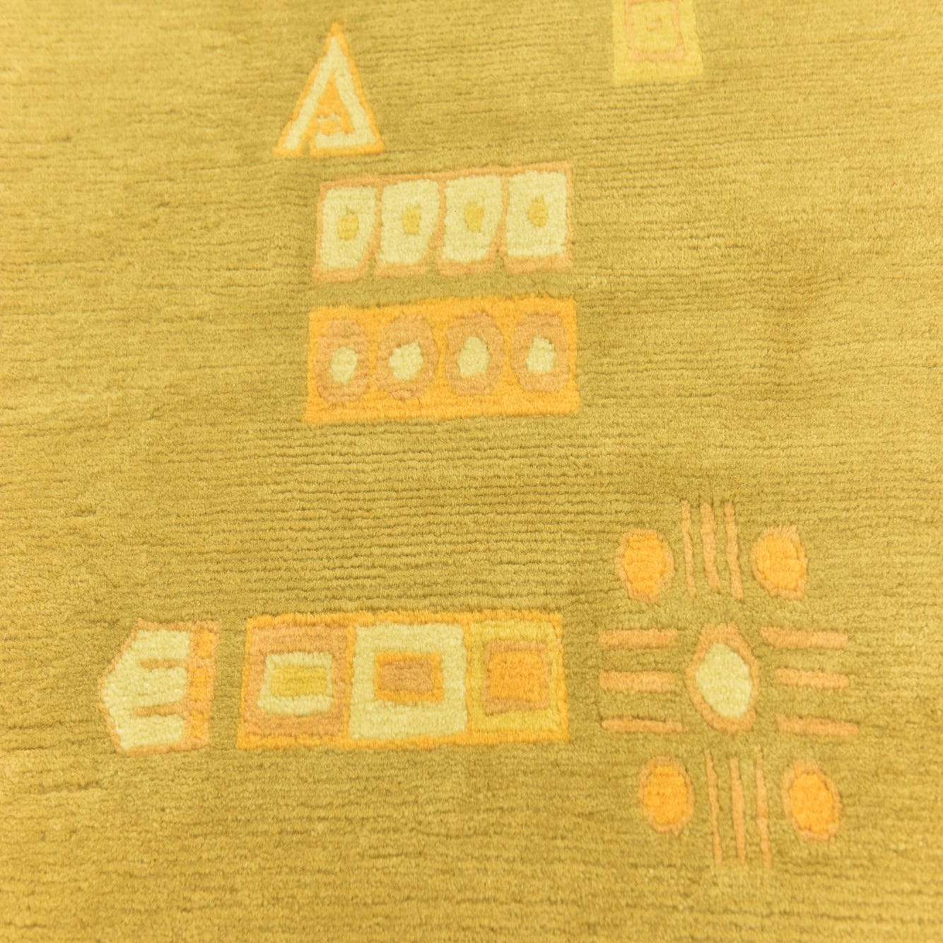 The Nepal collection presents a hand-knotted rug sized at 4x6, crafted with 100% wool to ensure durability and a luxurious underfoot feeling. Its gold background is complemented by a selection of warm and inviting hues including ivory, yellow, orange, and beige. The surface exhibits asymmetrical patterns with geometric motifs, showcasing subtle tribal inspirations.