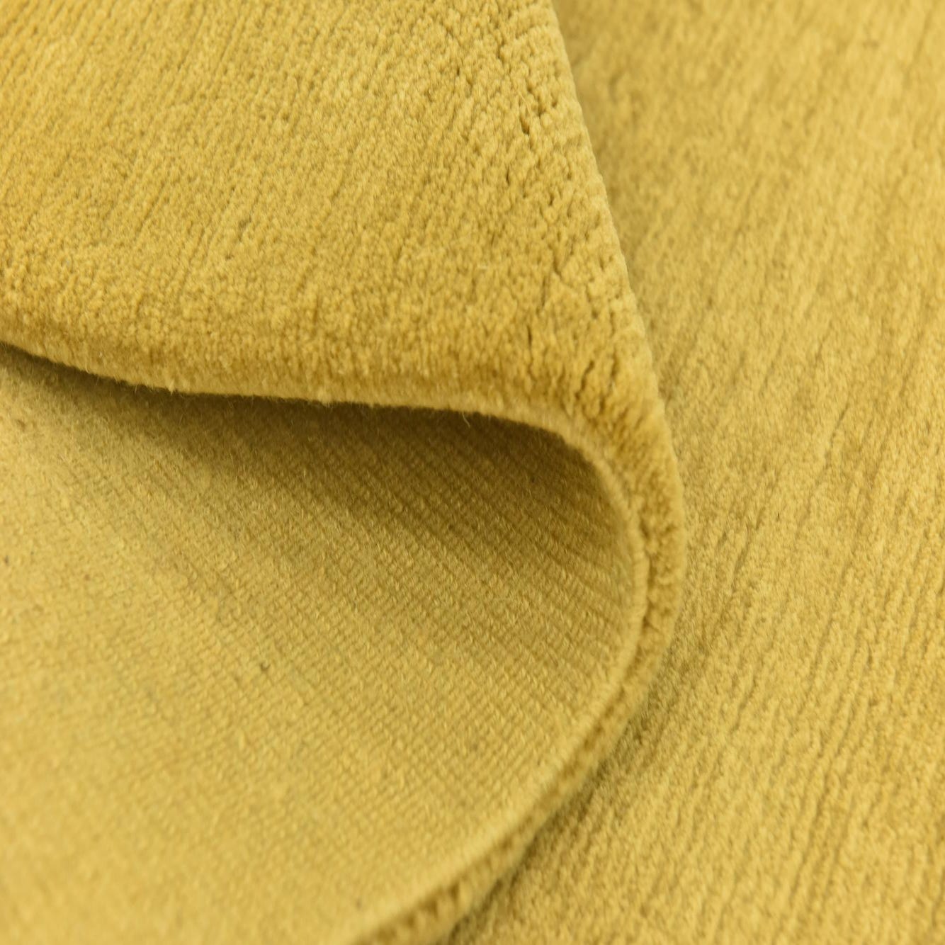 A 4x6 rectangular yellow wool rug with a high pile, featuring abstract geometric patterns in varying shades of yellow and gold, suitable for a living room or bedroom.