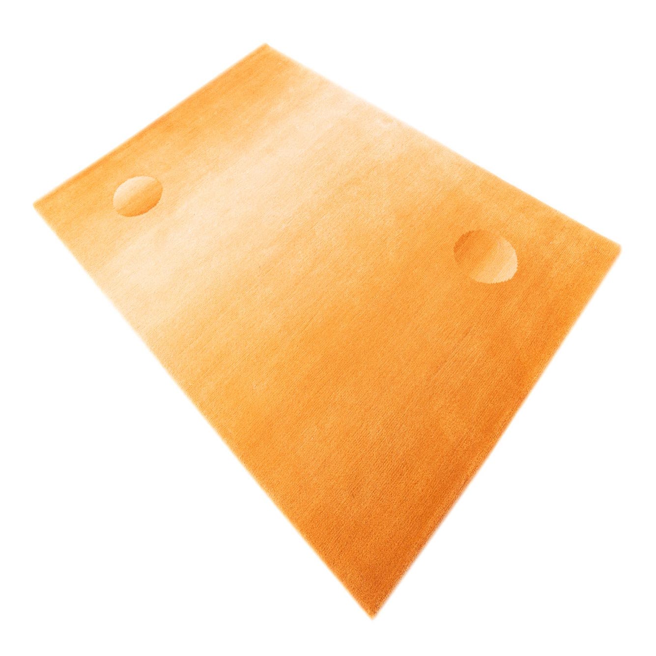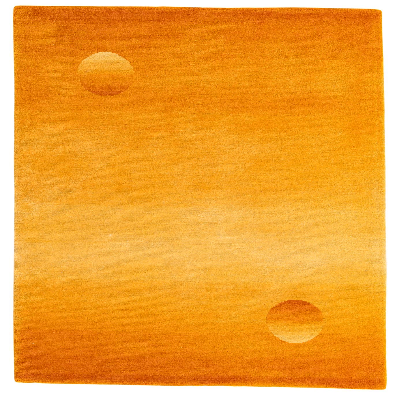 This Nepal collection rug is hand-knotted from 100% wool, offering both resilience and a soft touch. The rug measures 4x6 and features a minimalist design, distinguished by its compelling gold backdrop and the presence of two abstract circular shapes rendered in a subtle gradient of the same color palette. This use of tonal variation adds a sense of depth and artistic sophistication.