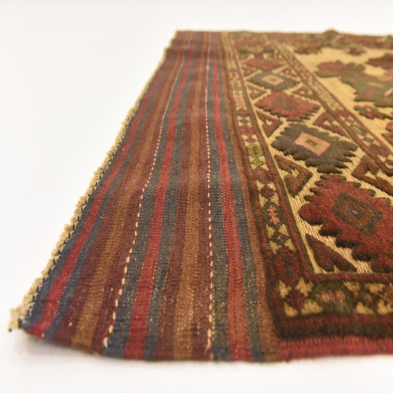 A 4x6 rectangular Sumak rug with a yellow-gold field, featuring two large, stylized maroon and brown medallions and a tribal border.