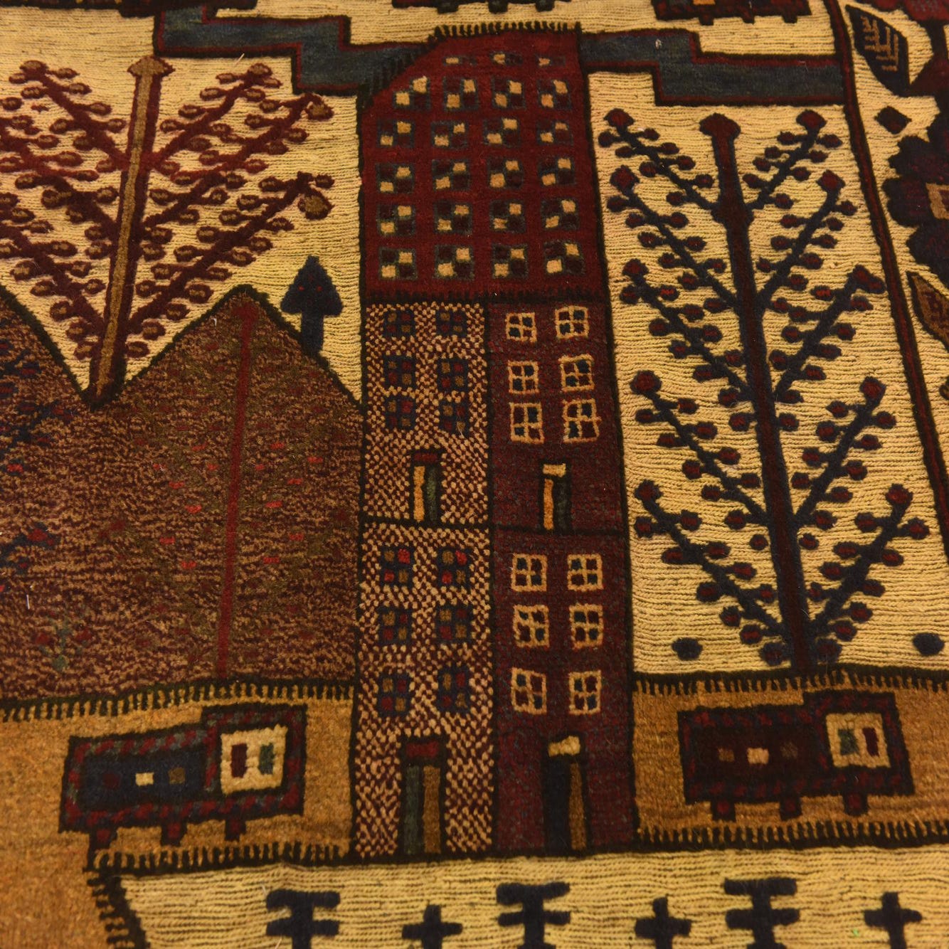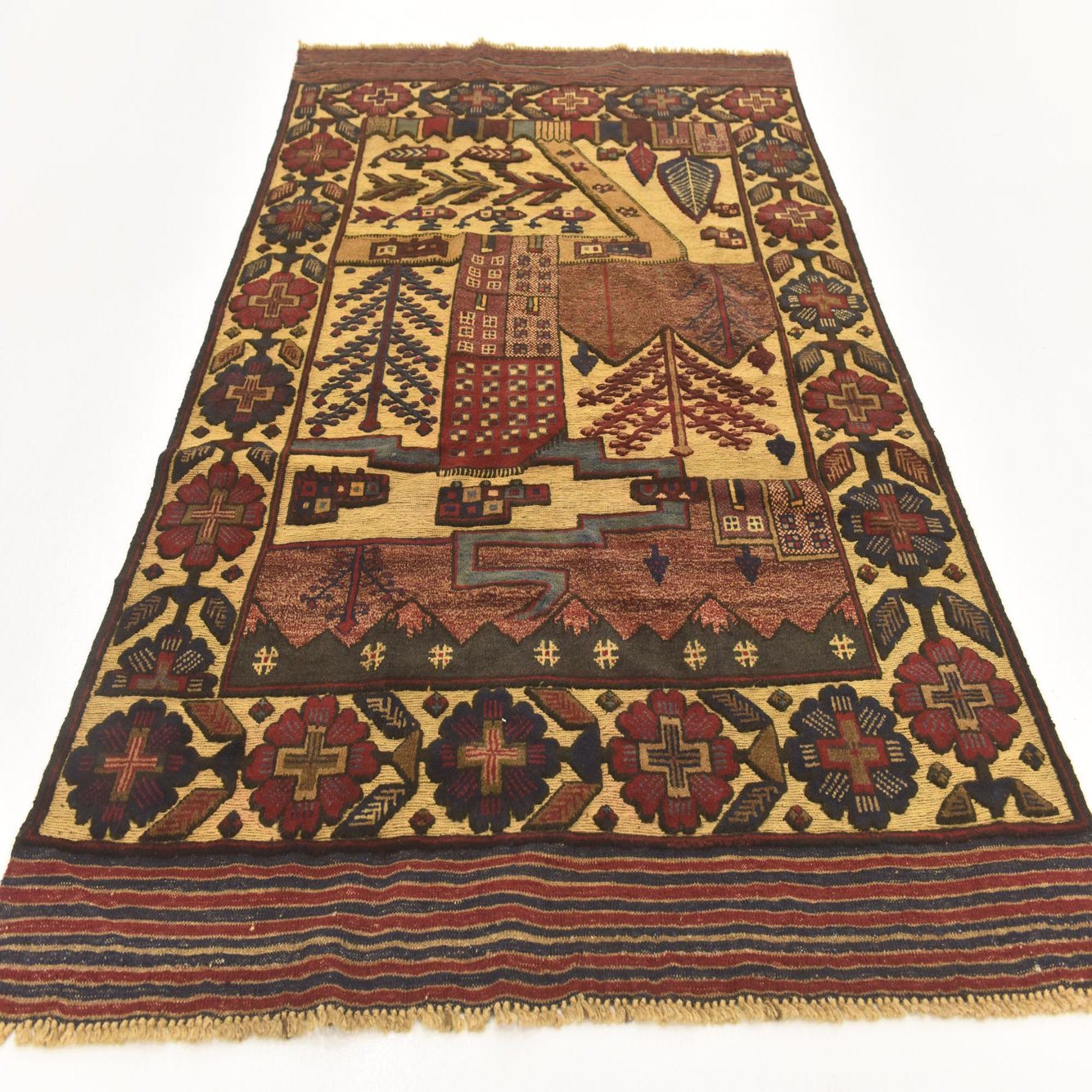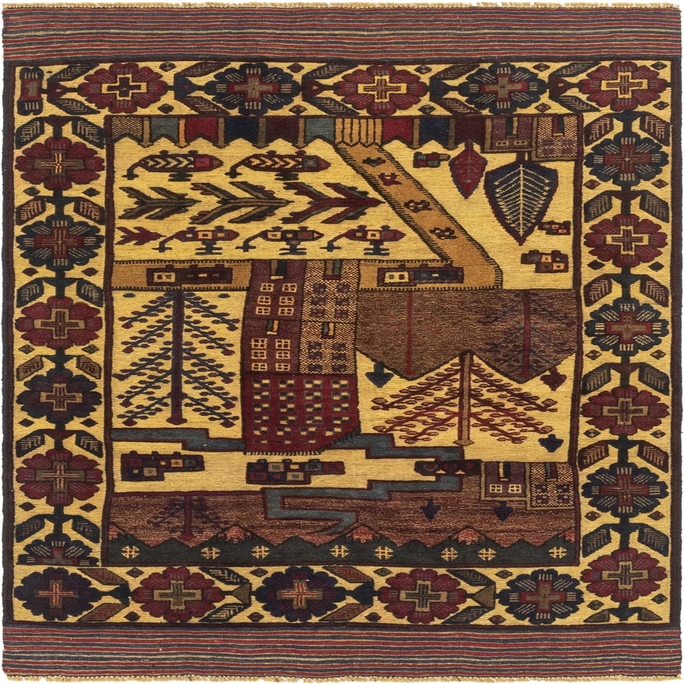 Primary color is Gold. Colors in this rug include: Gold, Black, Brown, Hunter Green, Light Brown, Maroon, Olive, Red.
