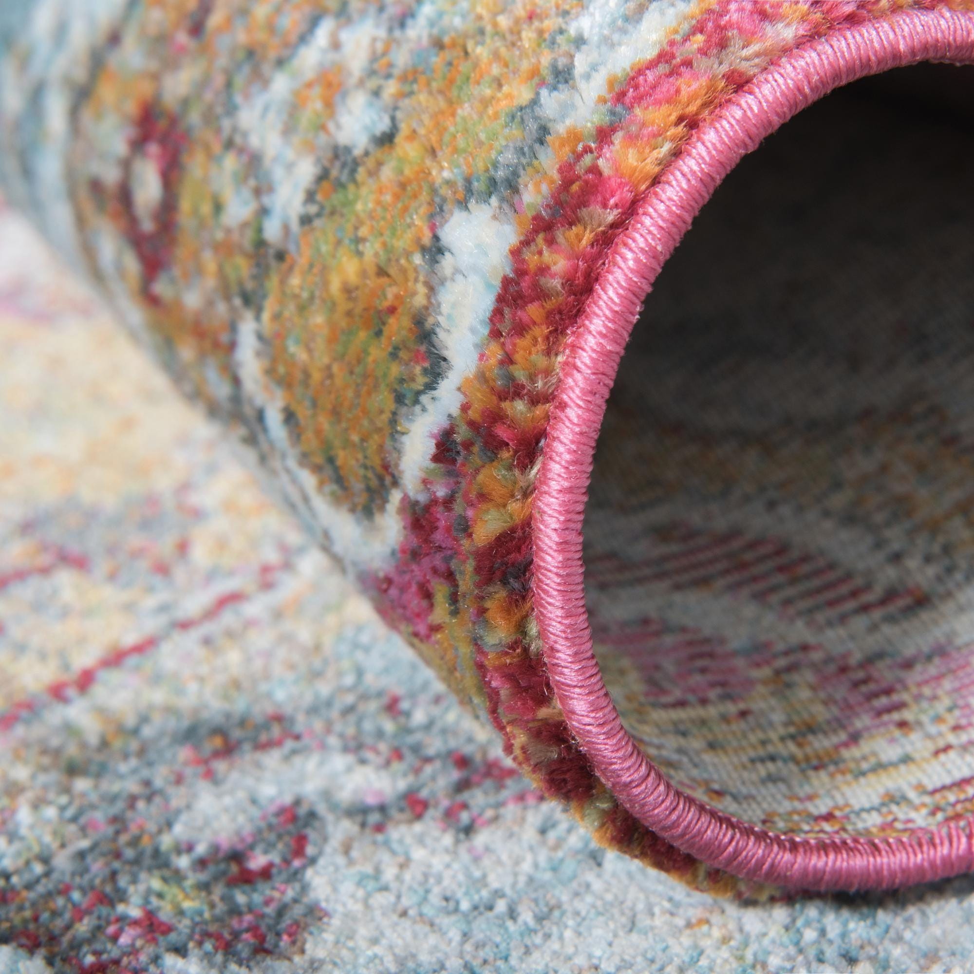 This round rug works well where you want a focused, colorful anchor: centered beneath a small dining table, layered in a cozy reading corner, or placed to define a seating area in a living room. Pair it with warm wood tones and leather for a classic look, mix it with neutral upholstery to let the colors pop, or blend it into a bohemian or global-inspired scheme with textured throws and eclectic accents.
