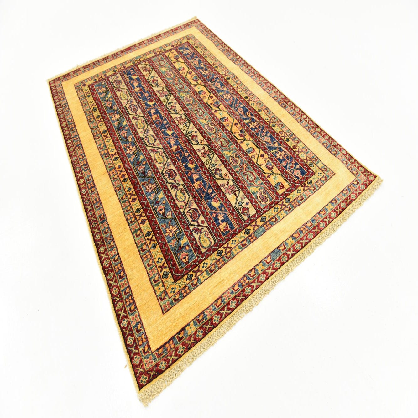 A 5x7 rectangular Ariana Ziegler rug featuring traditional Oriental stripes in yellow, gold, red, and blue.