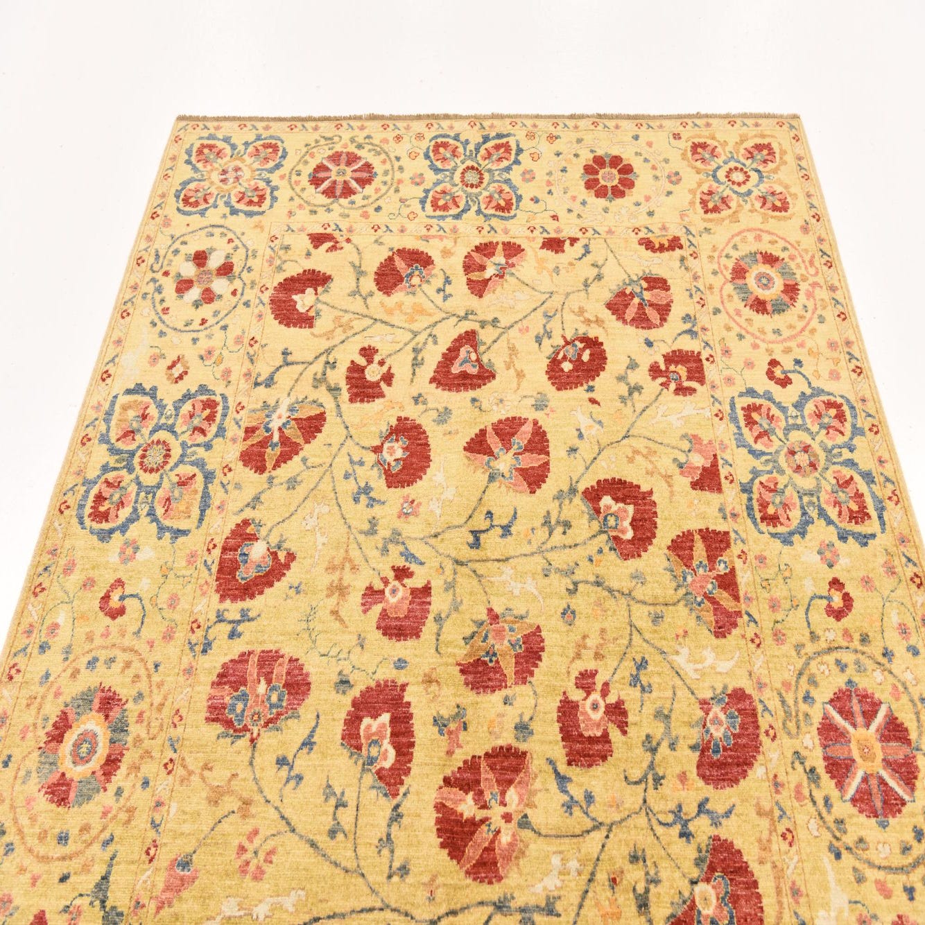 A 5x7 rectangular Ariana Ziegler rug featuring a yellow field with scattered red floral motifs and a border of blue and red medallions.