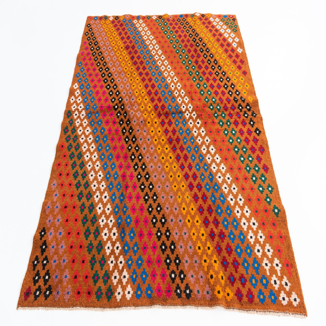 A 5x7 rectangular Balouch rug featuring a traditional tribal pattern of colorful diamonds in diagonal stripes on a warm gold background.
