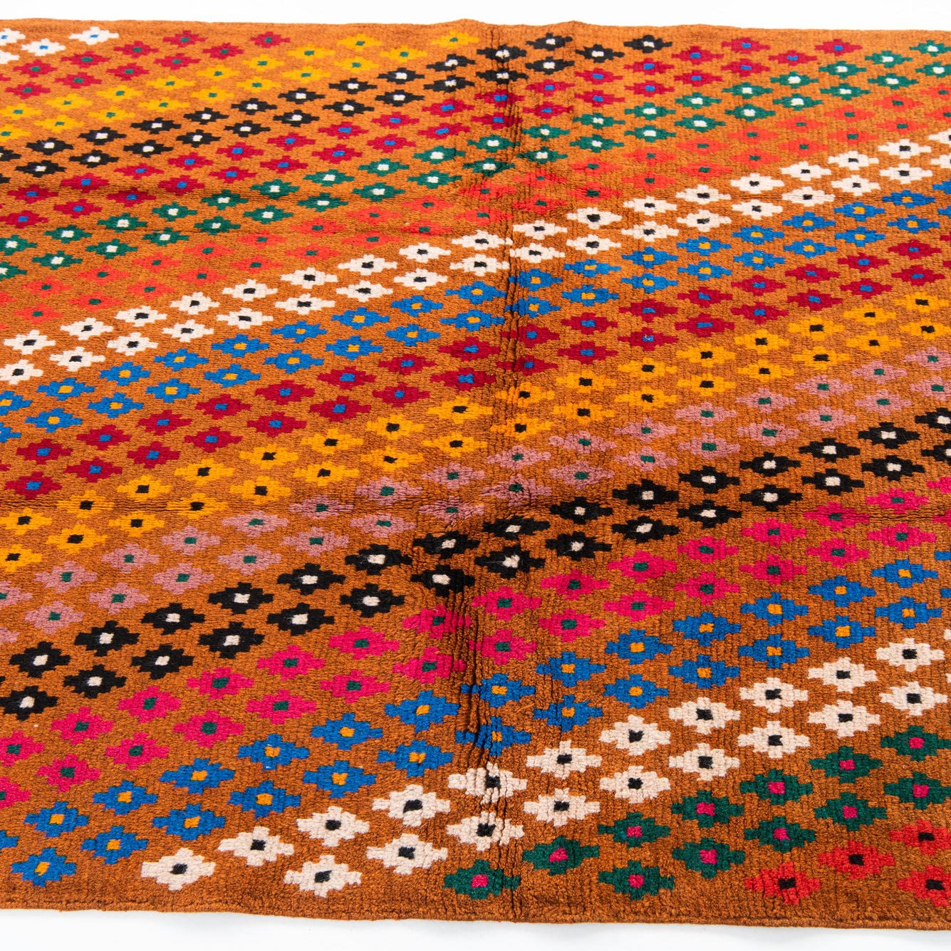 Given its color scheme and timeless style, this rug is well-suited for a variety of decor settings. It can serve as a striking focal point in a modern living space or add warmth to a traditional setting. The vibrant tones would also pair well with minimalist interiors that need a pop of color, or eclectic spaces that embrace a mix of patterns and textures. The Balouch rug's handcrafted nature ensures that each piece is unique, adding character and authenticity to any interior design.