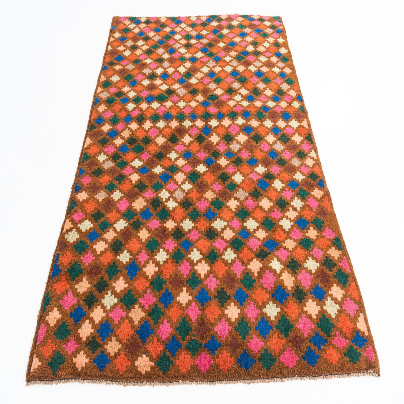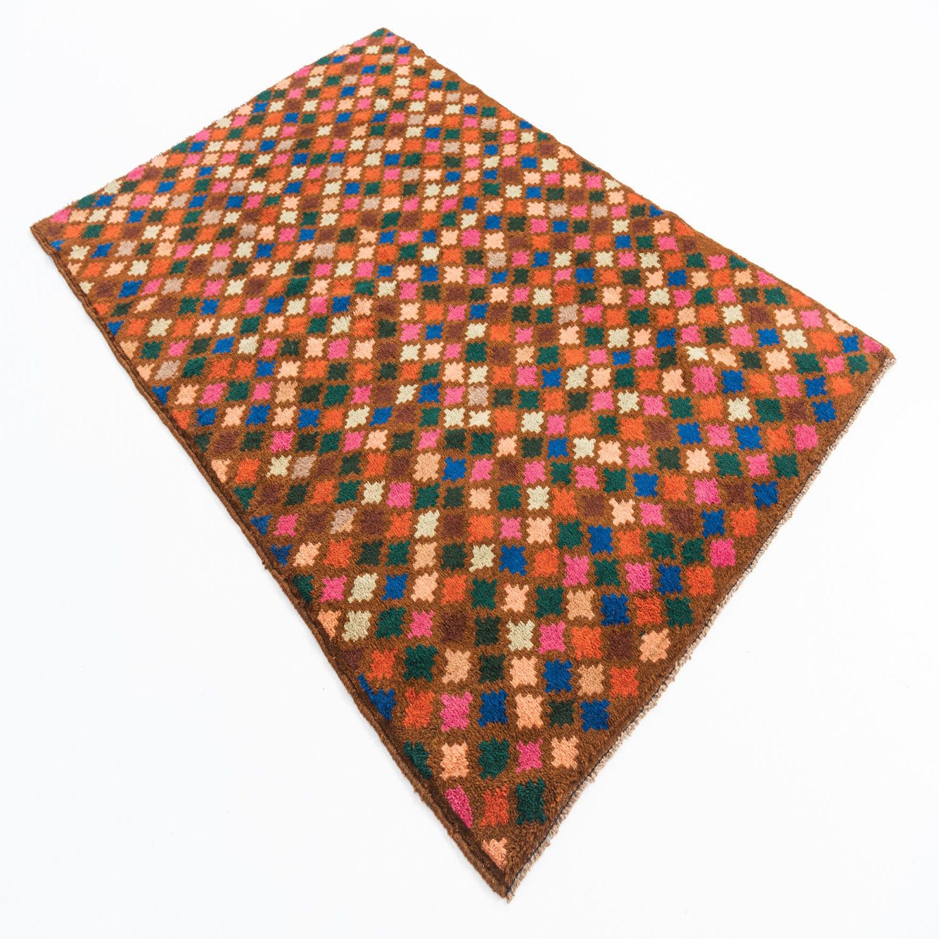A 5x7 rectangular Balouch rug with a traditional tribal pattern of colorful diamonds on a brown background.