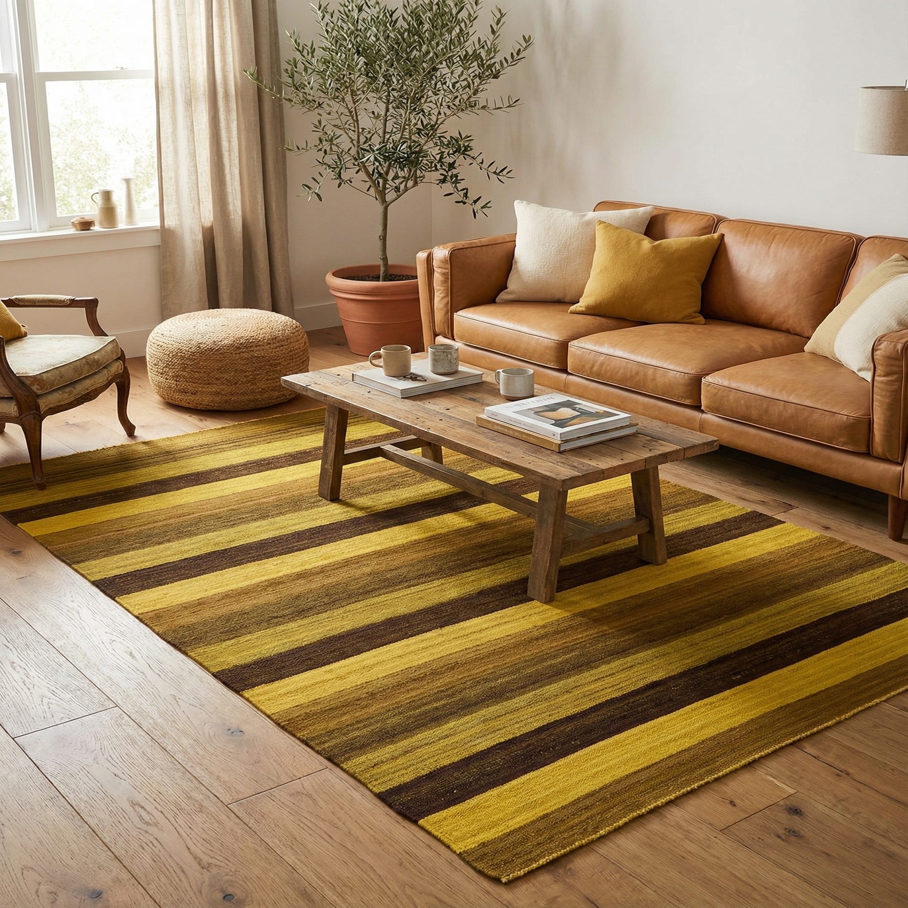 The color palette and simplistic, yet bold, stripe design allow this rug to complement various interior styles, such as modern minimalism, where it can serve as a grounding element, or in eclectic spaces where it can tie together various warm-toned accents. Given its flatweave construction, this rug is well-suited for dining areas, living rooms, or offices where furniture may move frequently, as well as in high-traffic zones due to its robust nature.