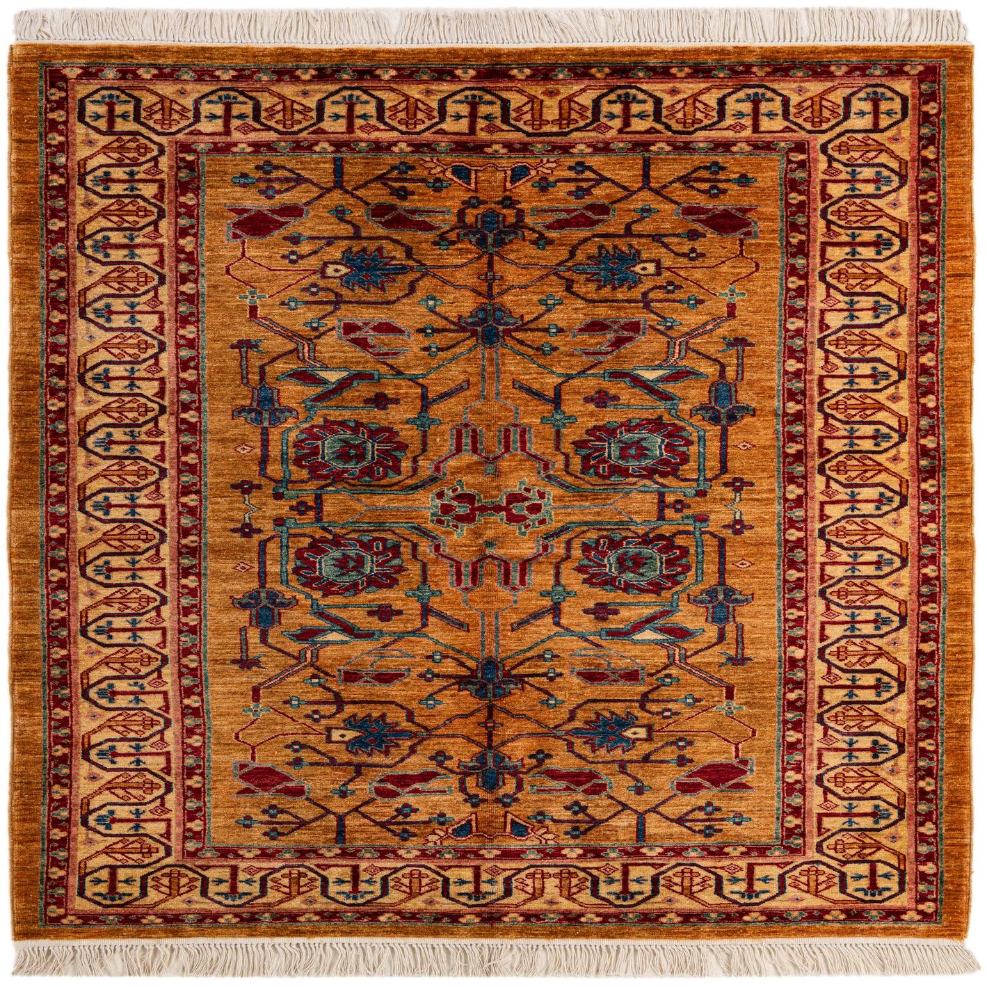 Primary color is Gold. Colors in this rug include: Gold, Ivory, Red, Blue, Navy Blue, Brown.