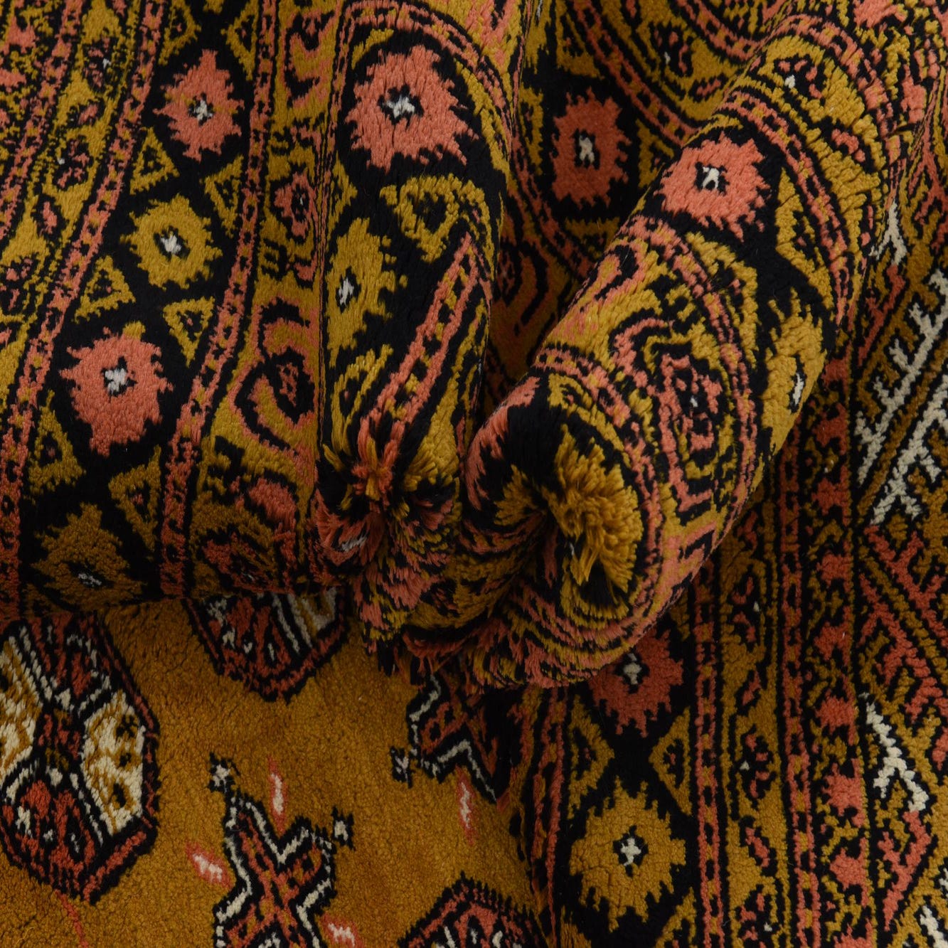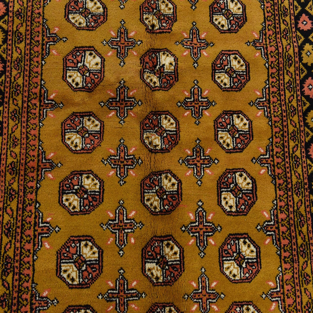 Primary color is Gold. Colors in this rug include: Gold, Black, Olive, Ivory, Light Salmon.