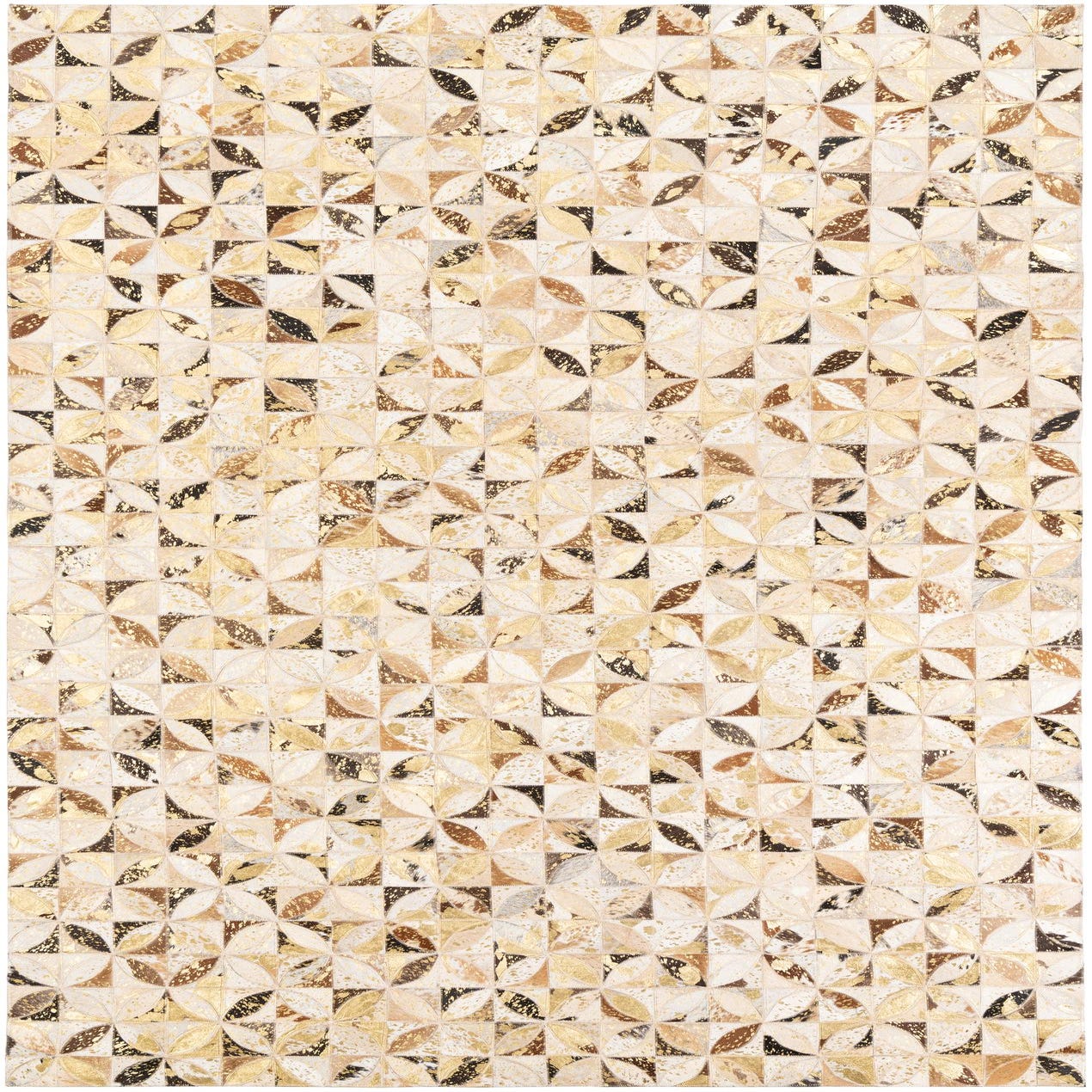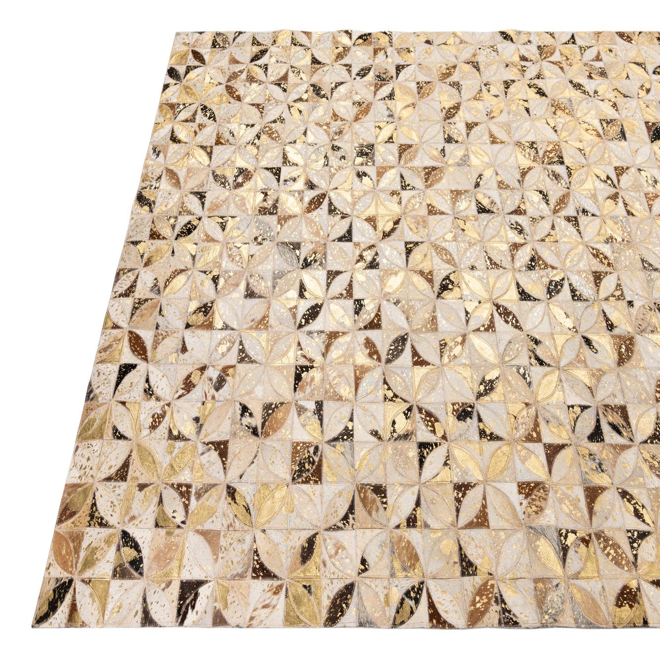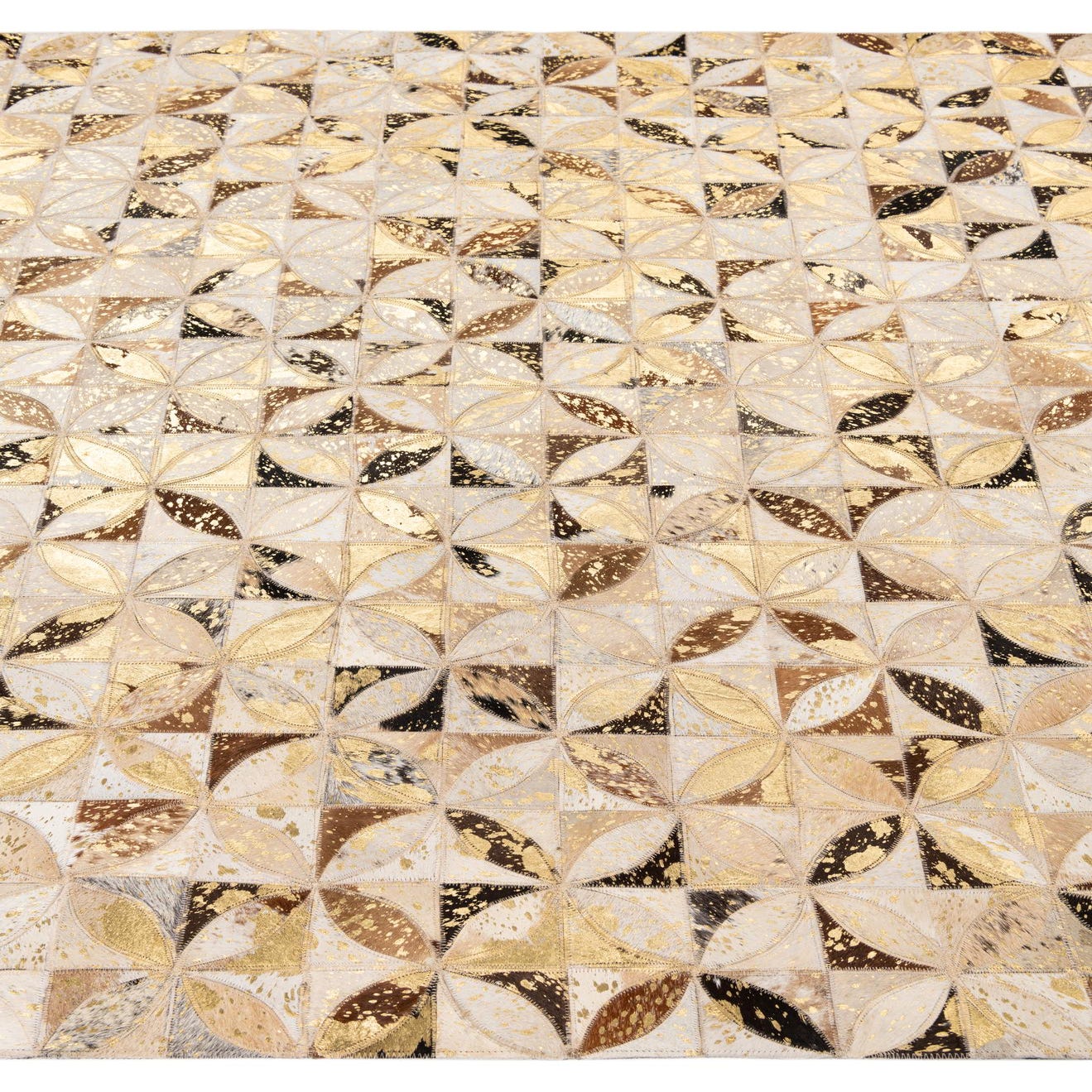 A 5x8 rectangular Cowhide Leather rug featuring a modern geometric pattern in various shades of yellow, gold, and brown.
