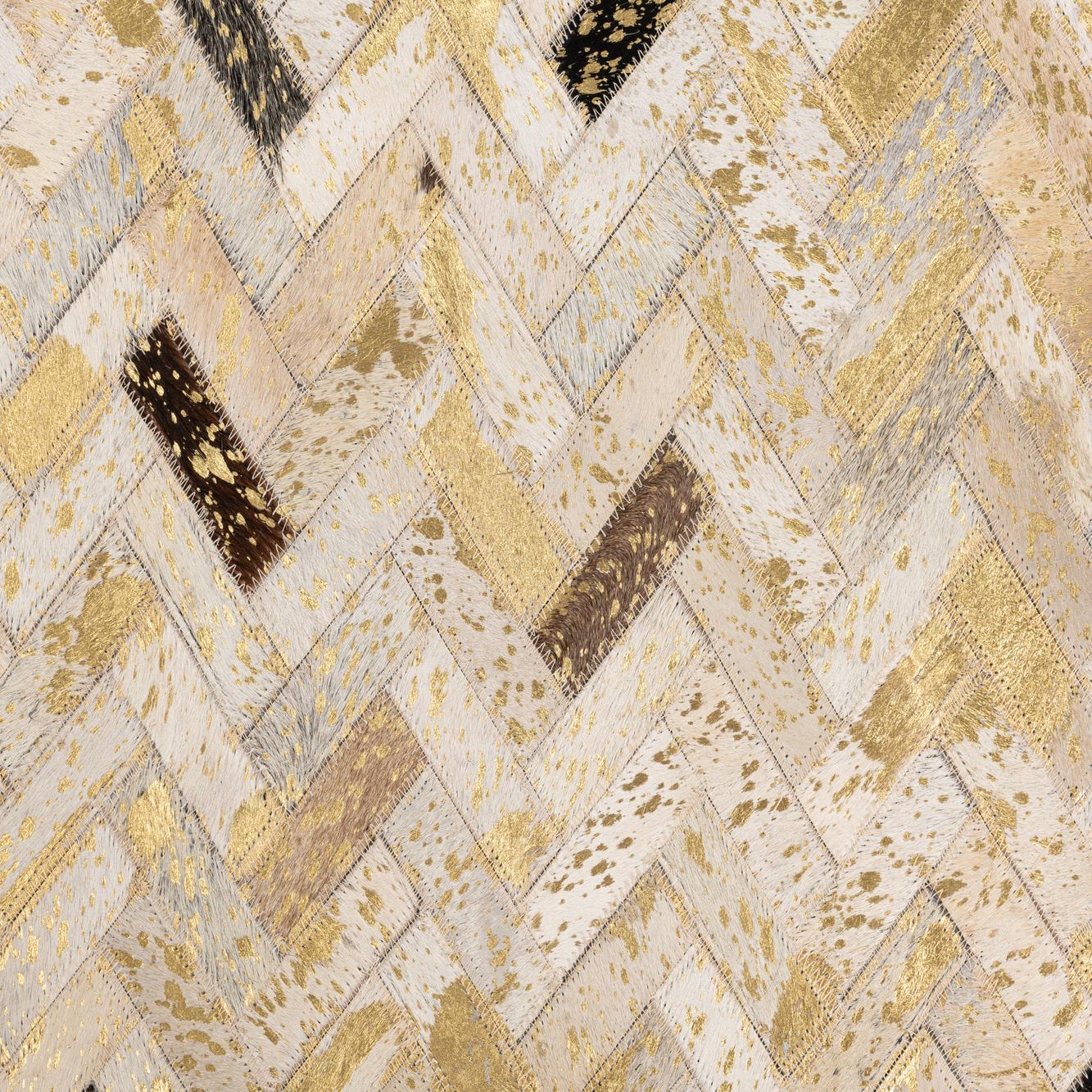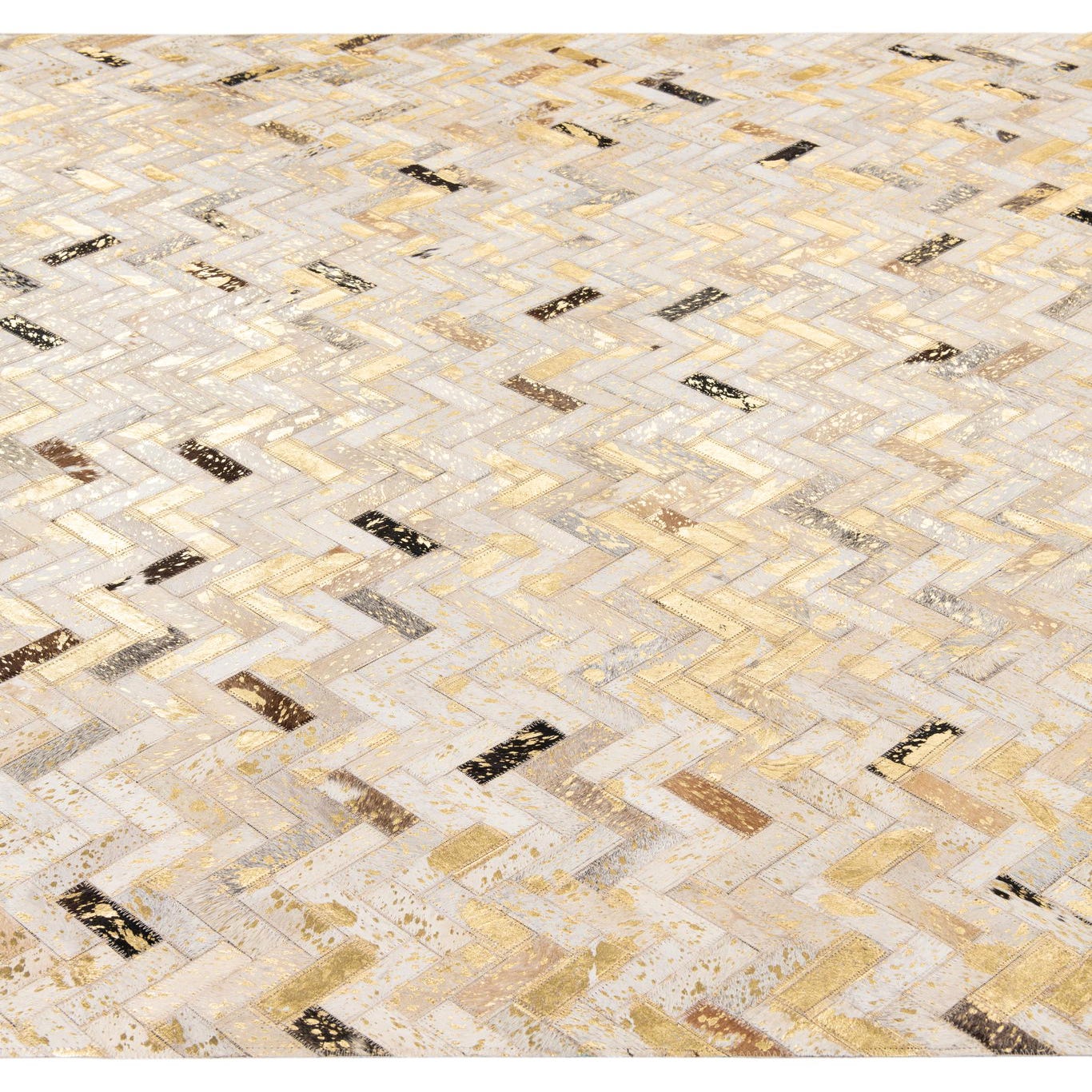 A 5x8 rectangular yellow and gold cowhide leather rug with a modern chevron stripe pattern, ideal for a living room.
