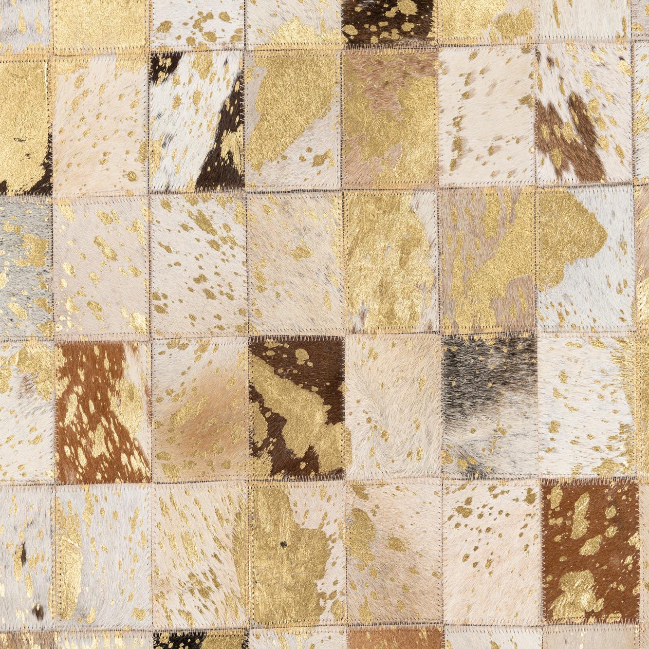 A refined patchwork of small, square cowhide tiles creates a tightly patterned checkerboard with a warm gold background that unifies the design. Each square displays natural hair-on-hide variation in cream, ivory, beige, brown and gray, with occasional gold-finish accents that catch the light. Hand made of cowhide & leather, the surface combines soft, tactile hair with smooth stitched leather seams for a layered, dimensional look and a low-profile feel underfoot.