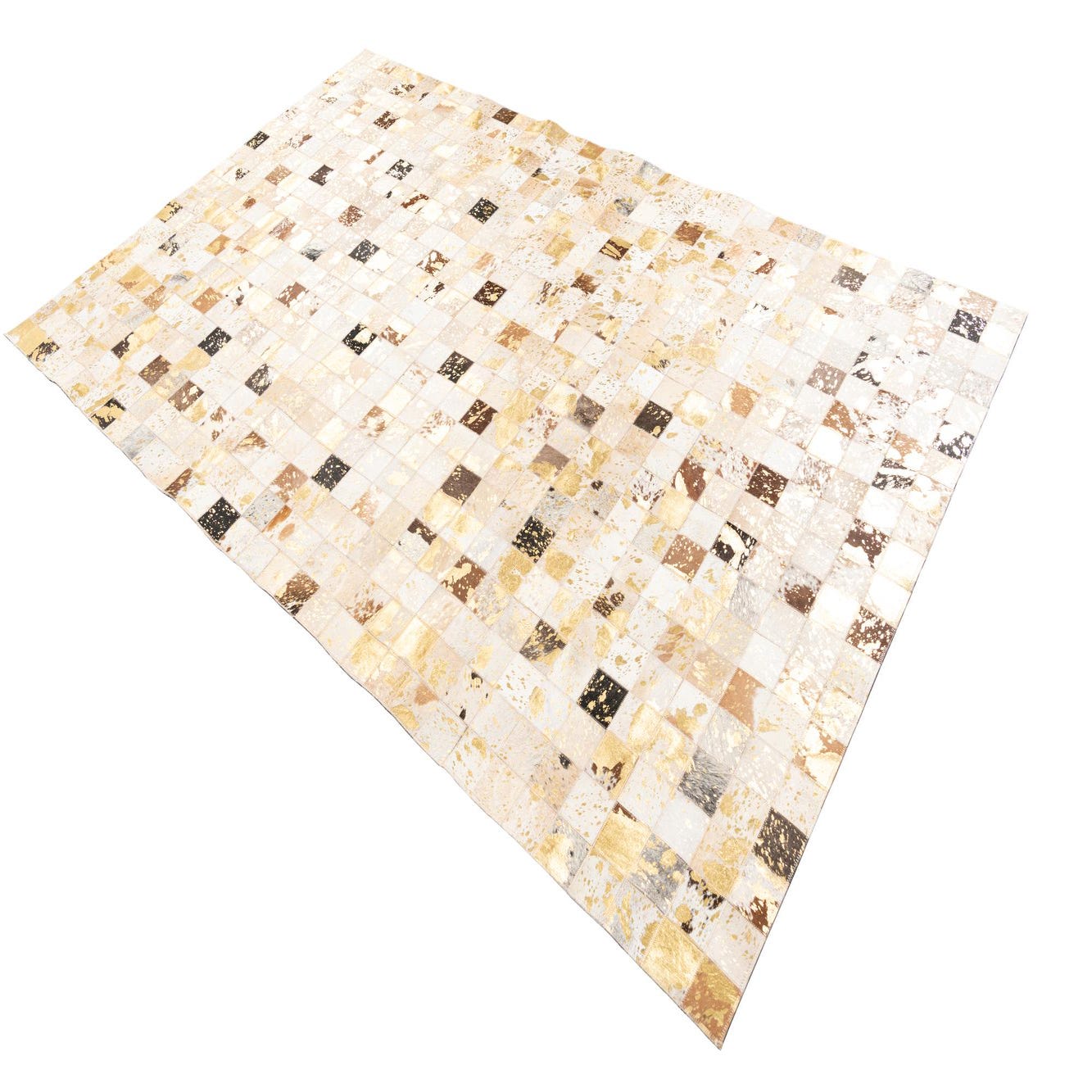 A 5x8 rectangular Cowhide & Leather rug featuring a modern, abstract patchwork design in varying shades of yellow, gold, brown, and black.
