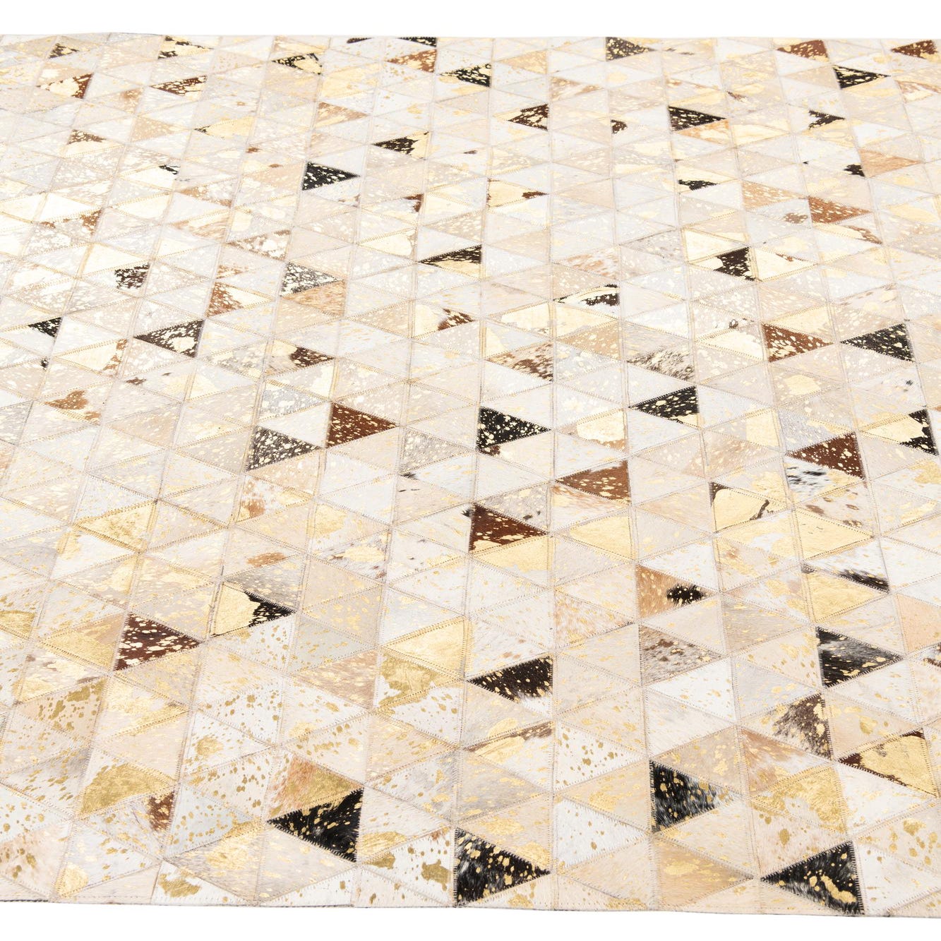 A 5x8 rectangular Cowhide Leather rug featuring a modern abstract geometric pattern of yellow, gold, and brown triangles.