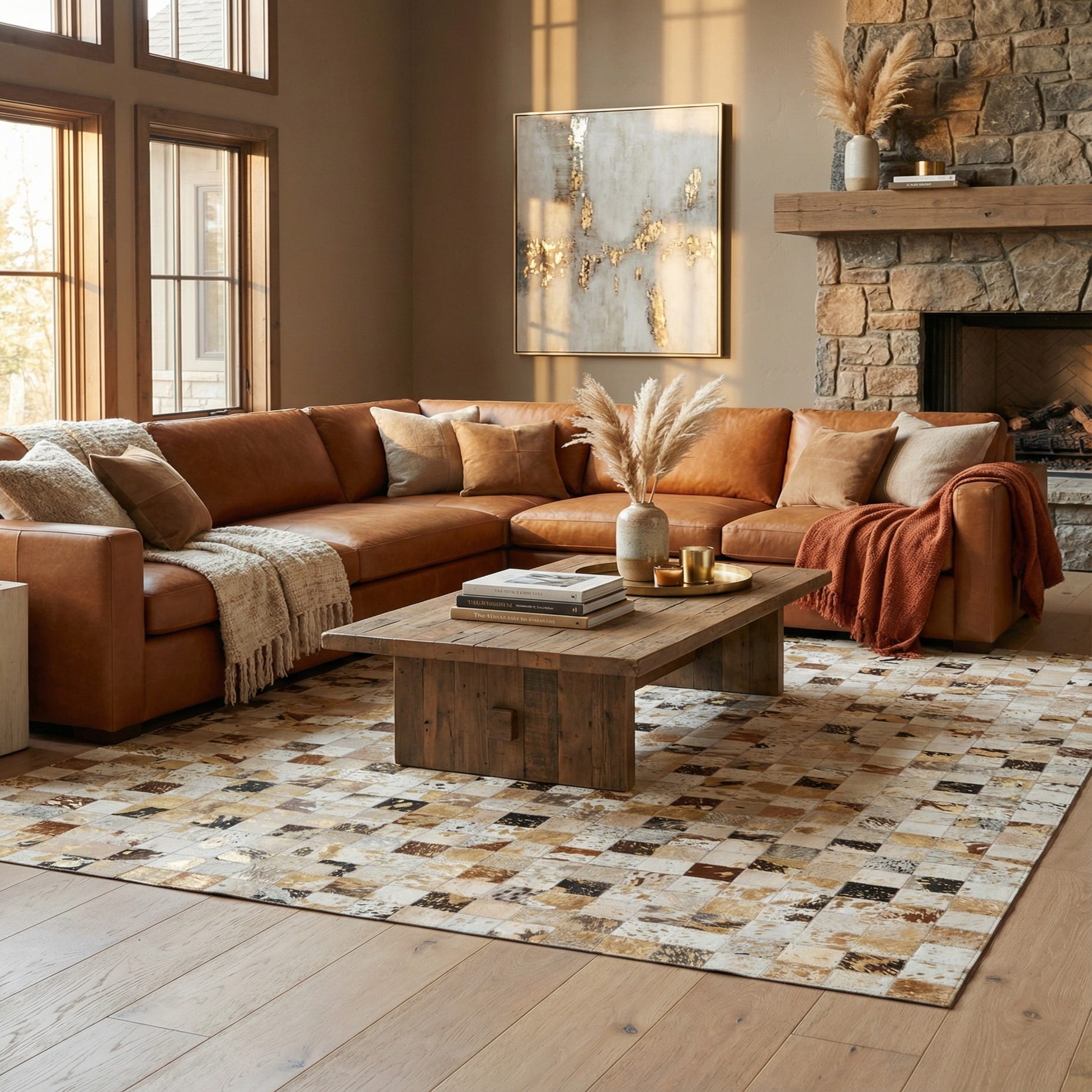 A 5x8 rectangular Cowhide Leather rug featuring a modern, abstract patchwork of gold, brown, and white squares.