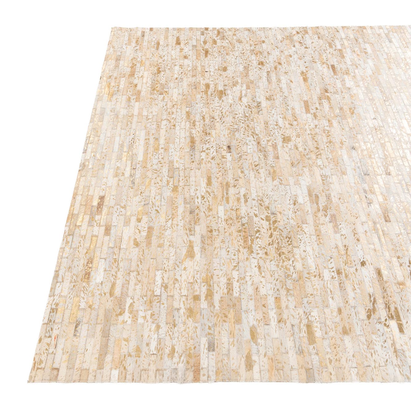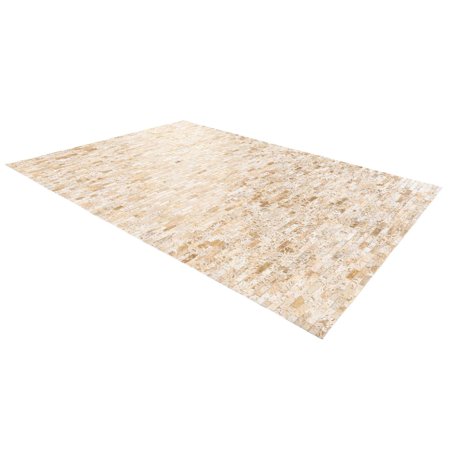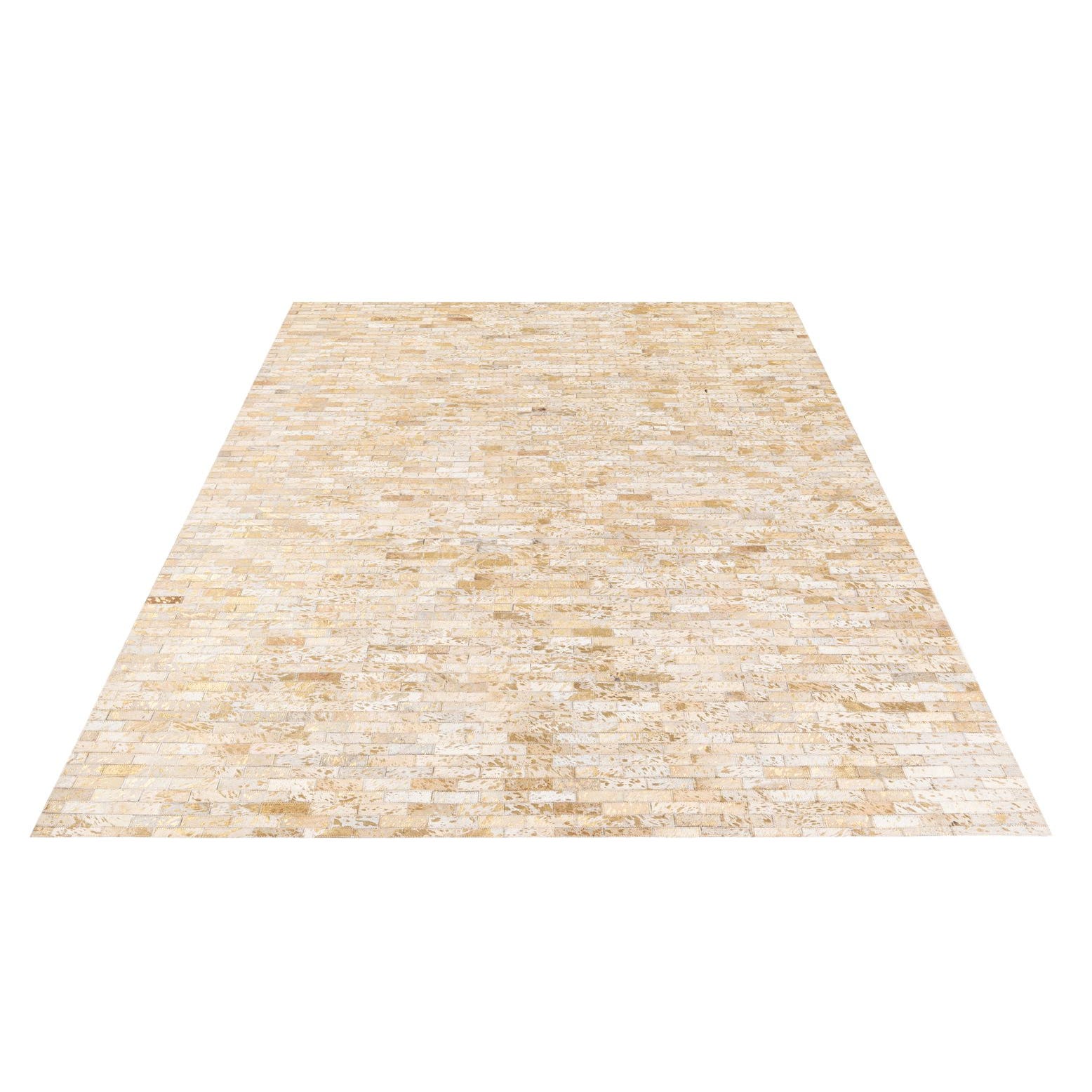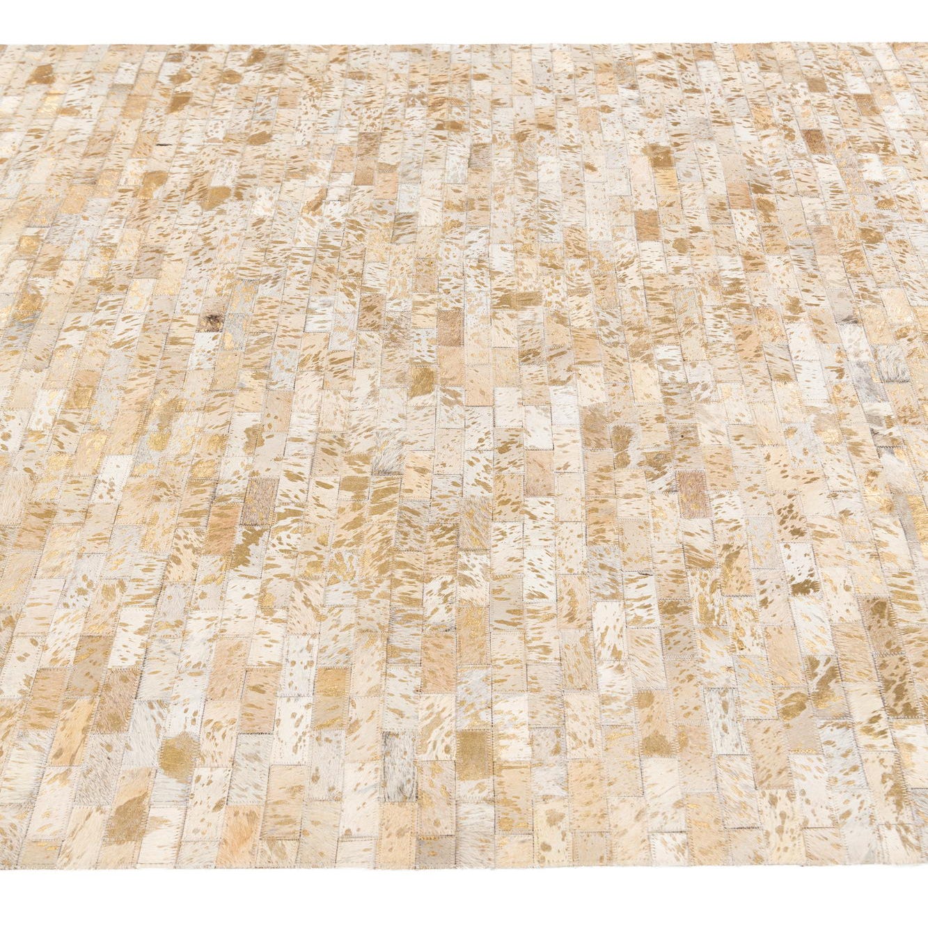 A 5x8 rectangular Cowhide Stocks rug from Rugs.com featuring a patchwork geometric pattern in varying shades of yellow and gold, ideal for a living room.