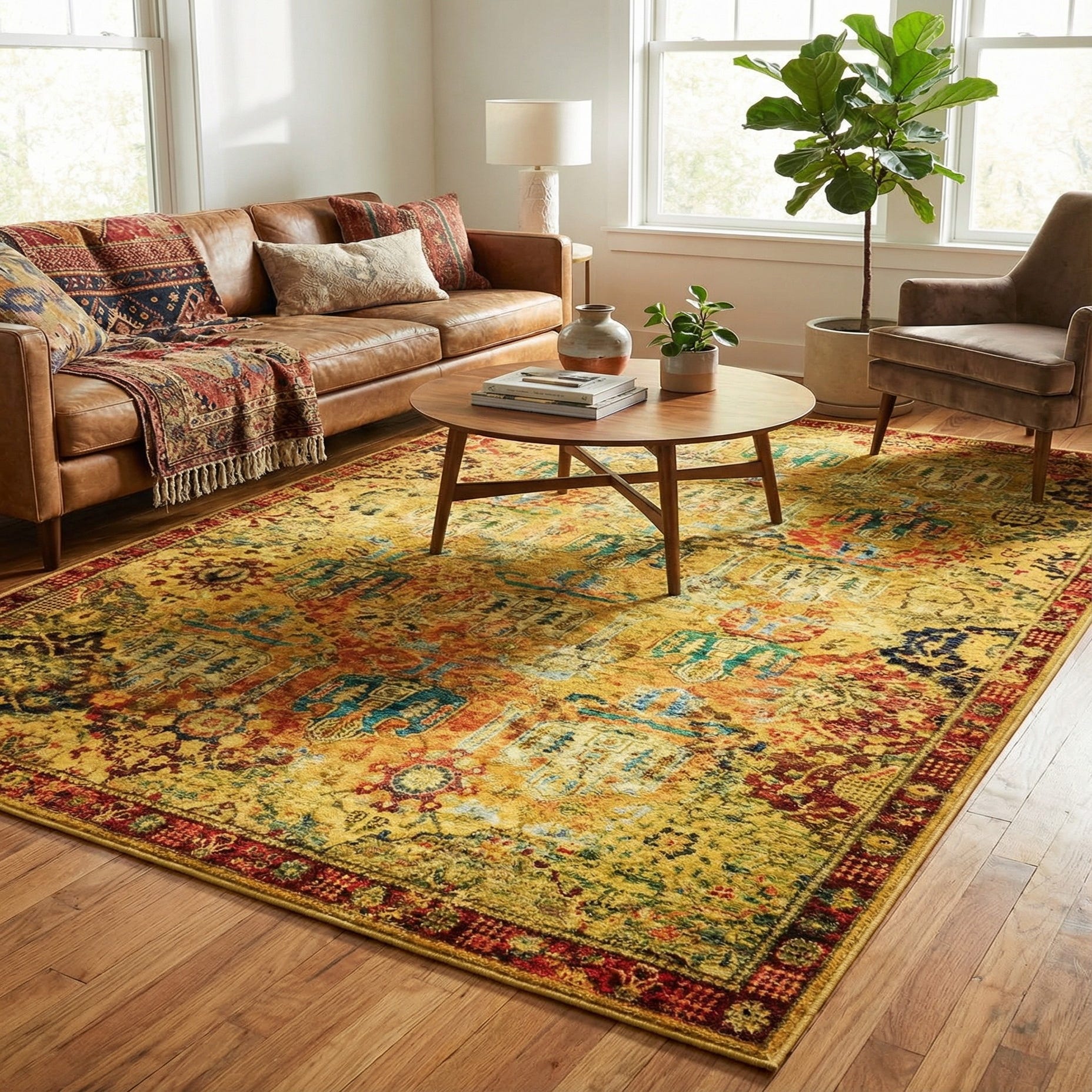 Primary color is Gold. Colors in this rug include: Gold, Green, Orange, Rust Red, Burgundy, Red, Light Blue.