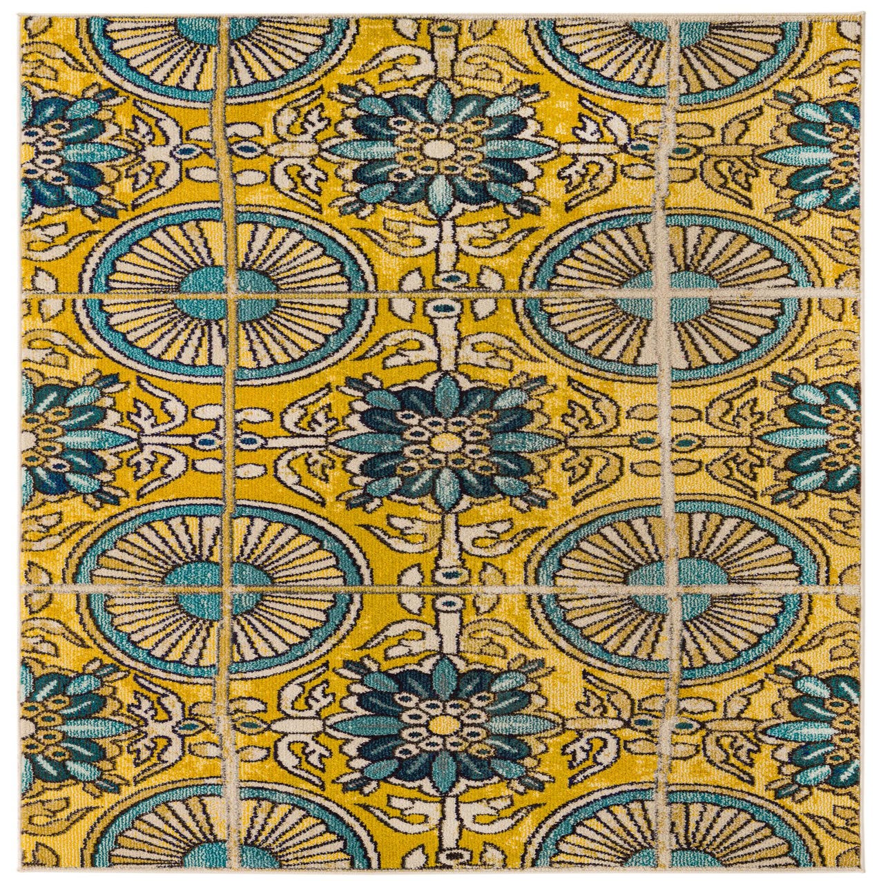 Primary color is Gold. Colors in this rug include: Gold, Blue, Navy Blue, Beige, Brown.