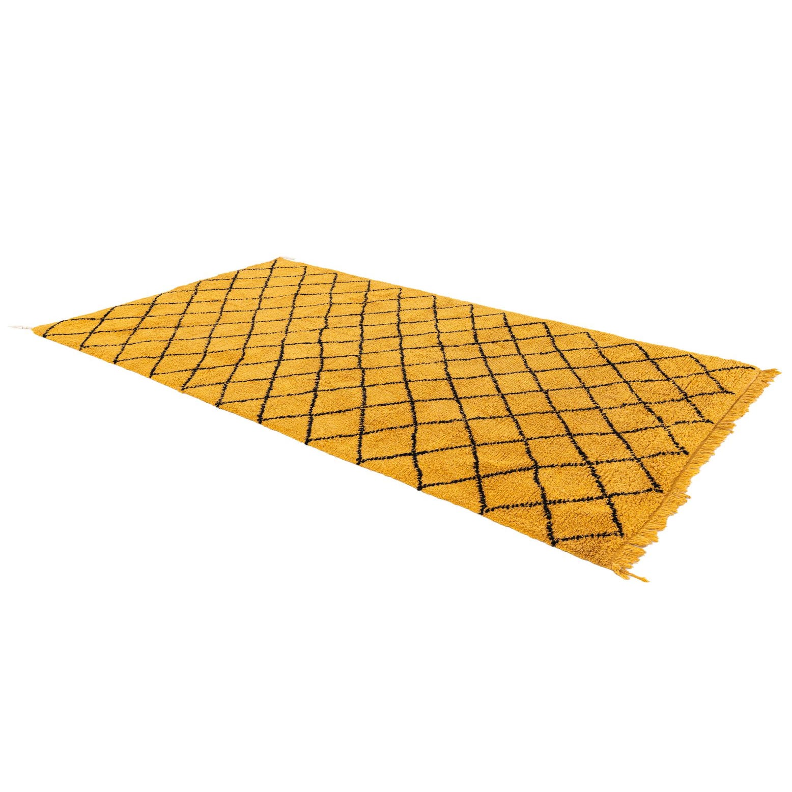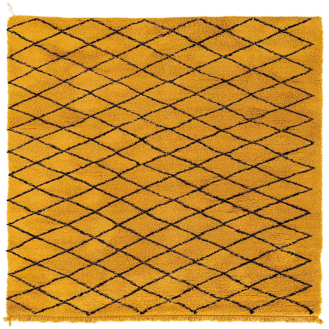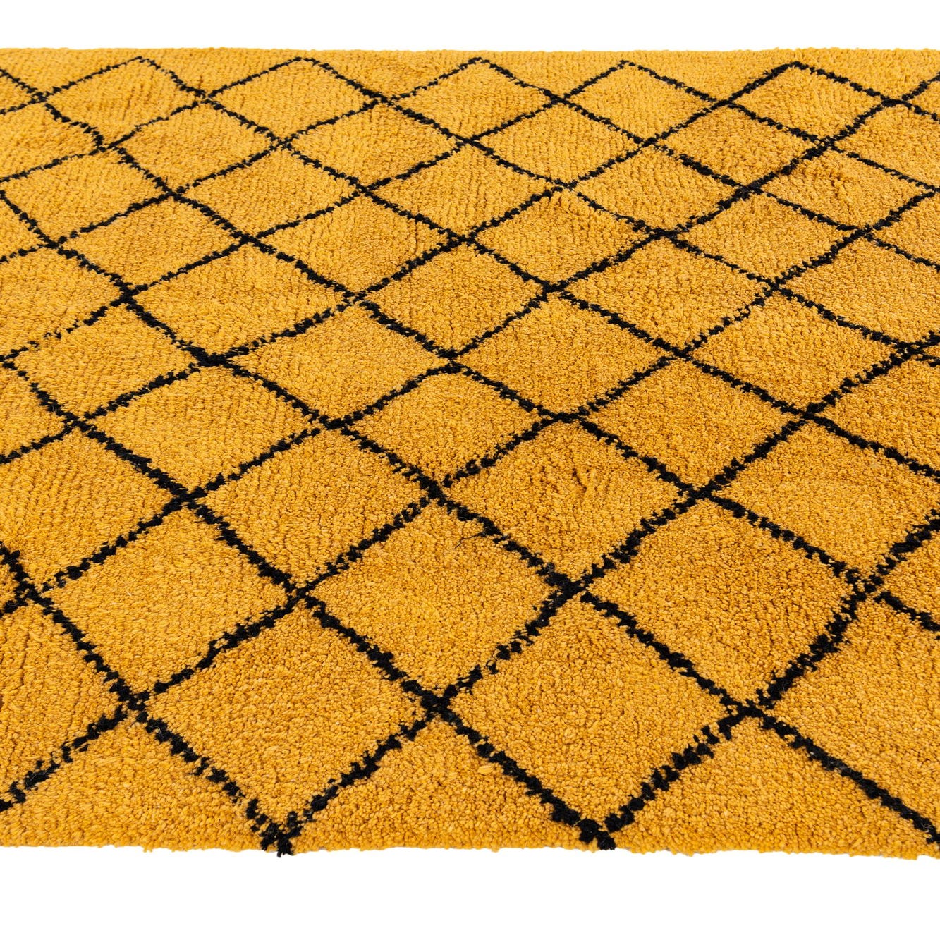 This Moroccan collection rug showcases a timeless diamond lattice pattern, rendered in a bold black on a vibrant gold background. The hand-knotted 100% wool composition ensures a durable texture that provides both warmth and tactile comfort underfoot.