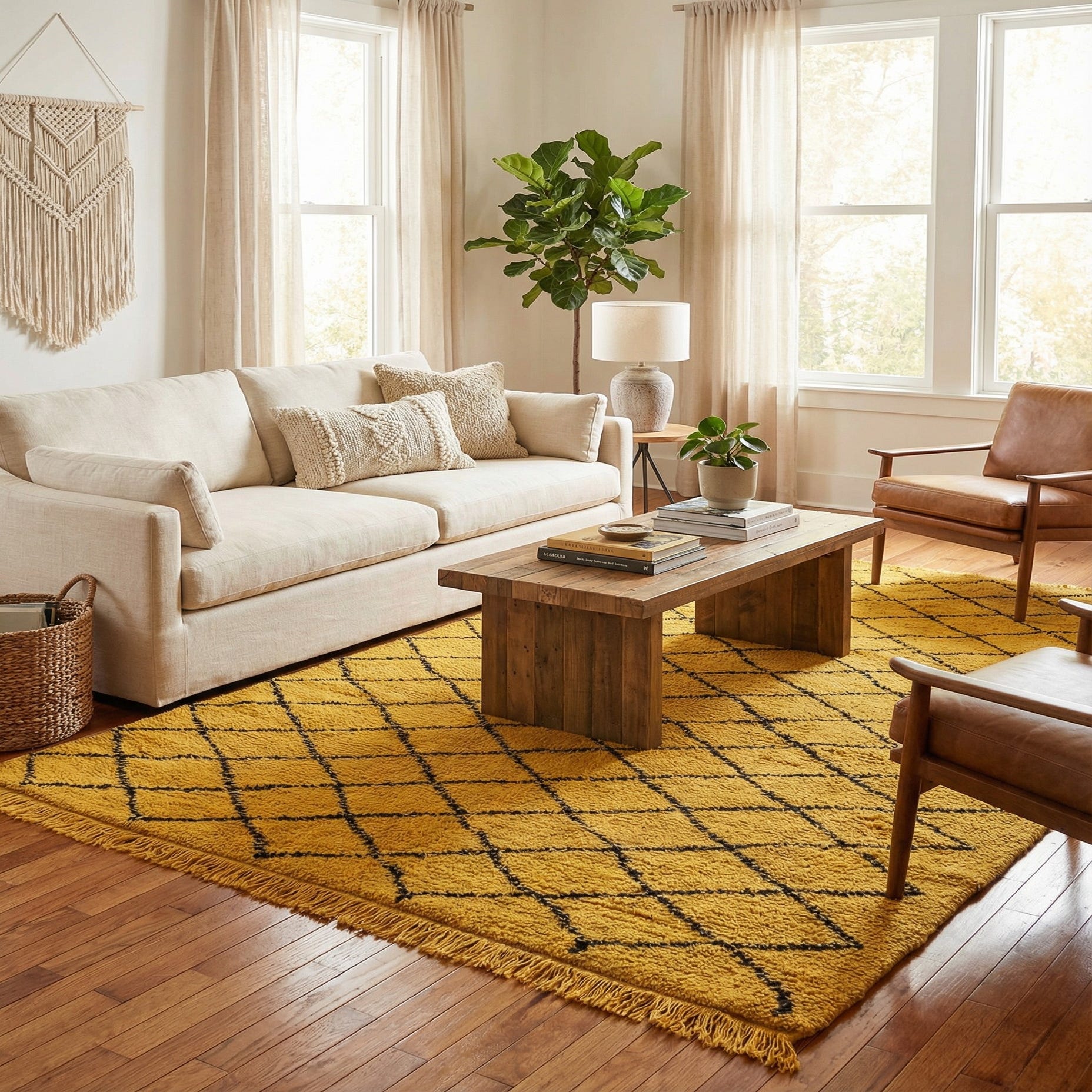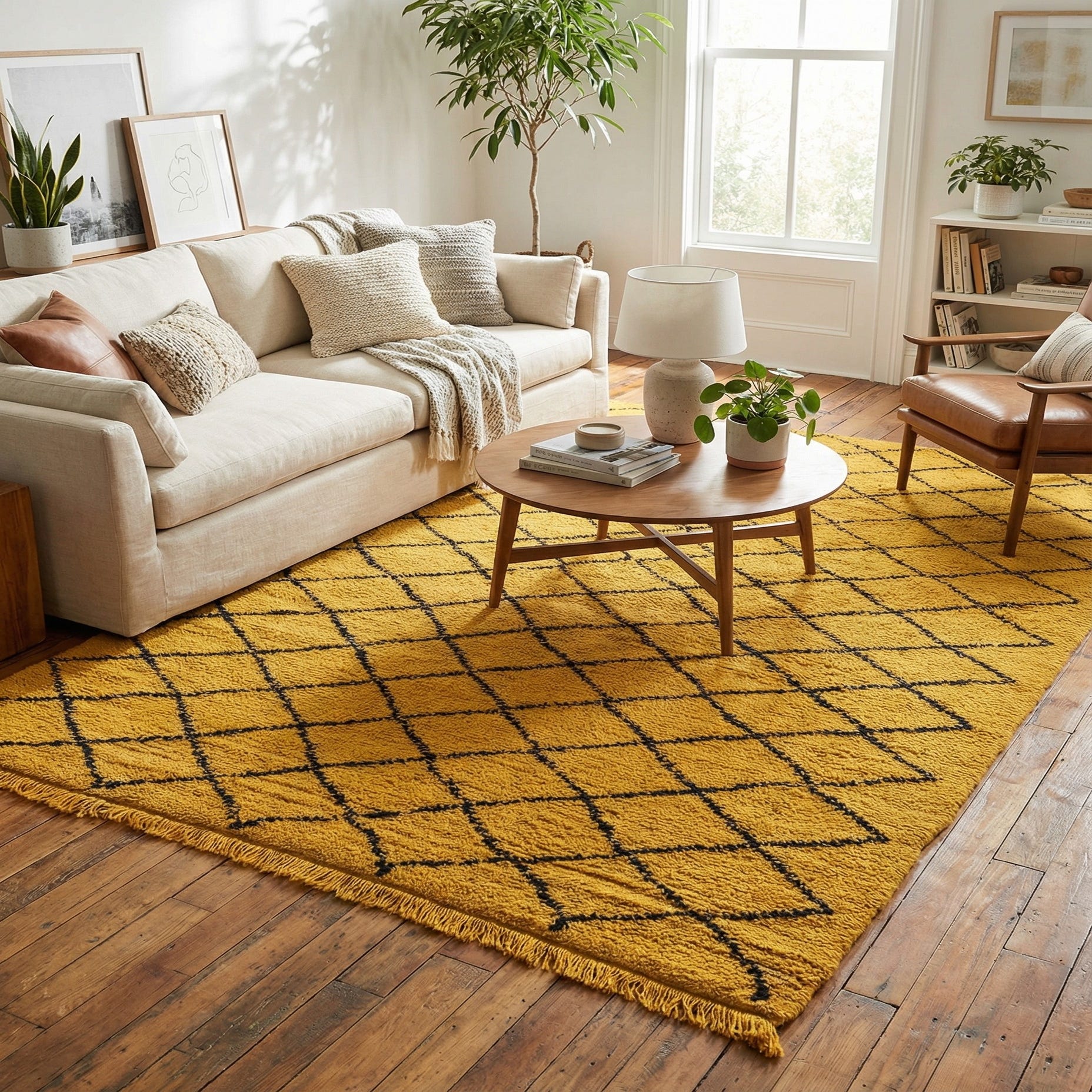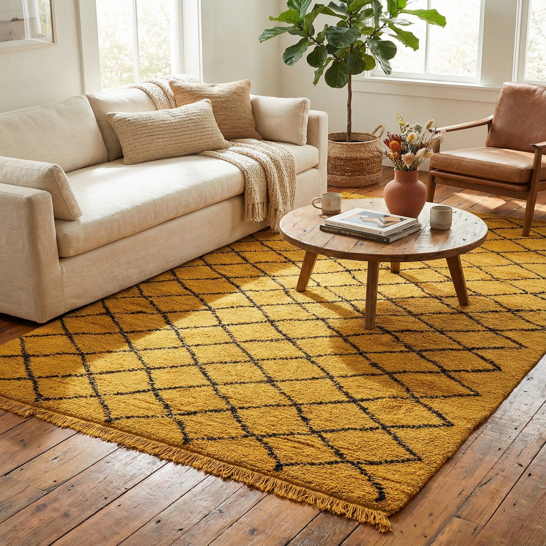 This Moroccan collection rug showcases a timeless diamond lattice pattern, rendered in a bold black on a vibrant gold background. The hand-knotted 100% wool composition ensures a durable texture that provides both warmth and tactile comfort underfoot.