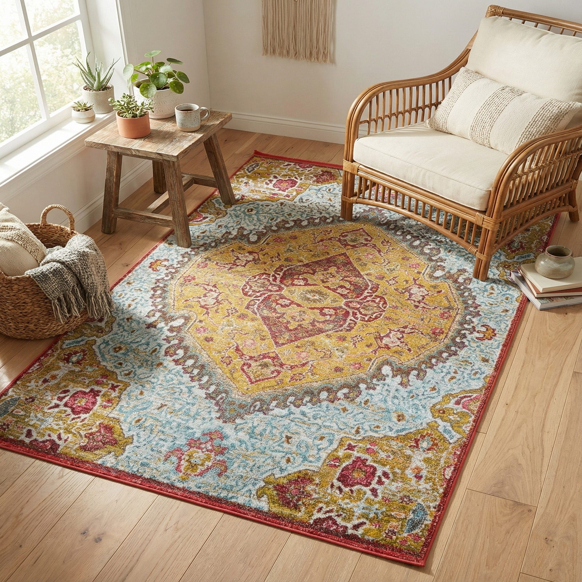 Place it to anchor a seating area beneath a coffee table or to add color and pattern in a bedroom layered over hardwood floors. It pairs well with warm wood tones and neutral upholstery, and also complements eclectic or bohemian interiors where mixed color and pattern are central. In more contemporary settings it can act as a focal point against clean-lined furniture, while in transitional rooms it brings a touch of vintage character without feeling overly formal.