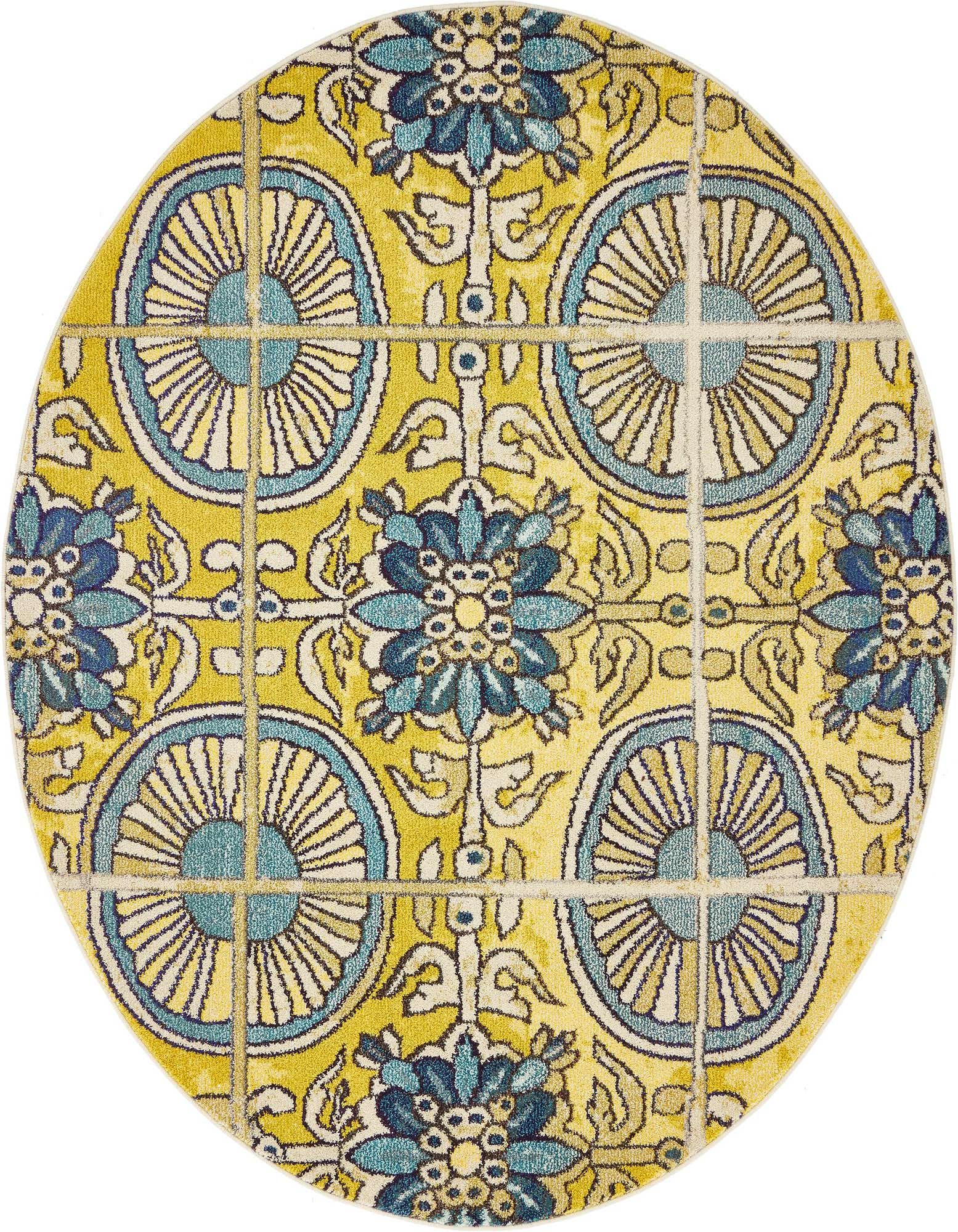 Primary color is Gold. Colors in this rug include: Gold, Blue, Navy Blue, Beige, Brown.