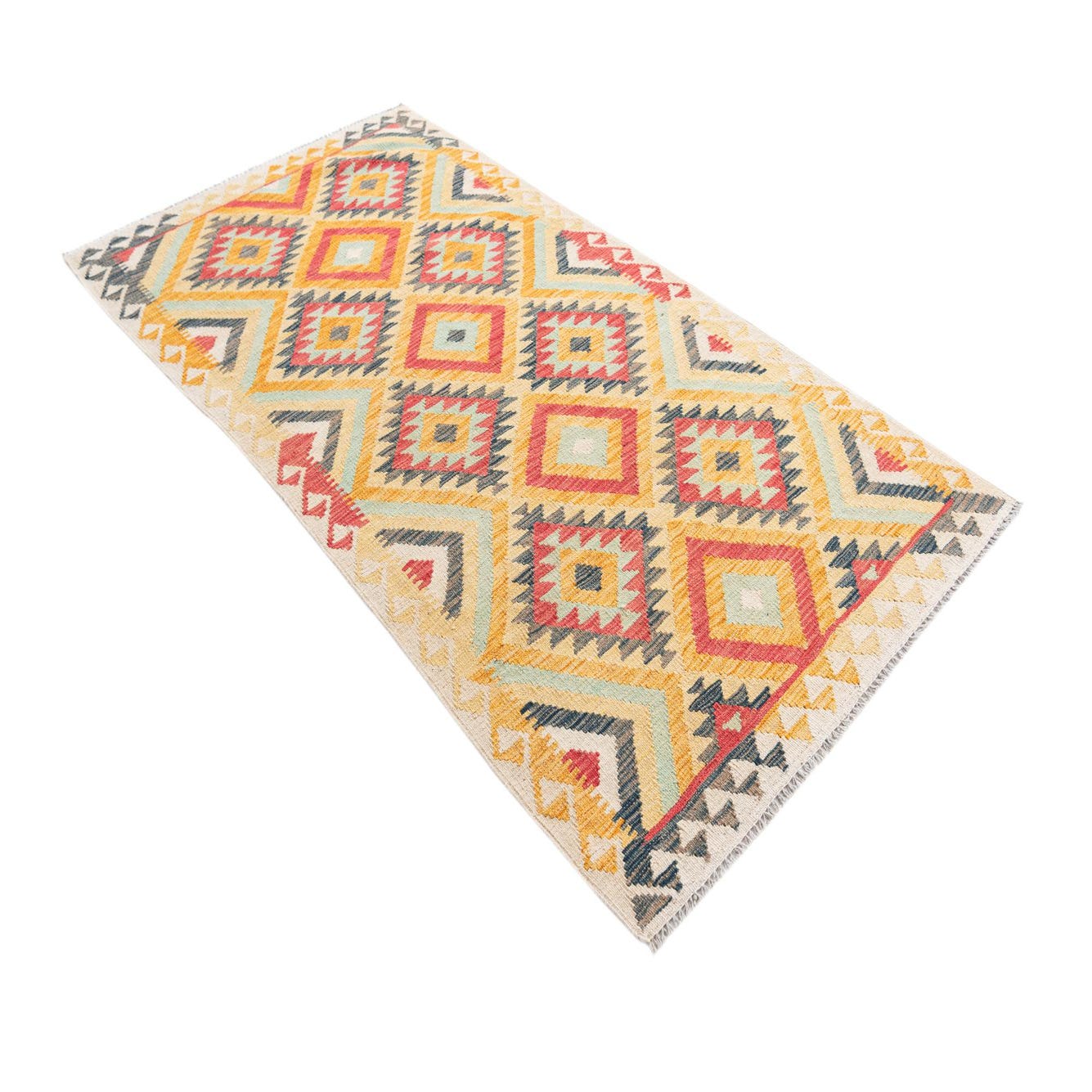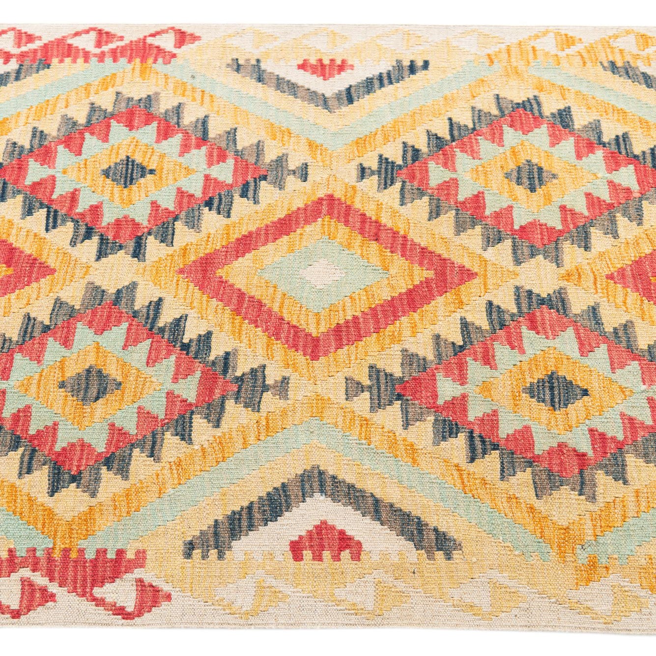 This Kilim Maymana collection runner is a handwoven piece crafted from 100% wool, measuring 6 feet in length. The rug showcases a traditional Kilim geometric pattern, harmoniously blending colors such as gold, beige, black, light green, red, ivory, and blue with a gold background. The texture is typical of flatweave rugs, imparting a sense of durability and understated sophistication.