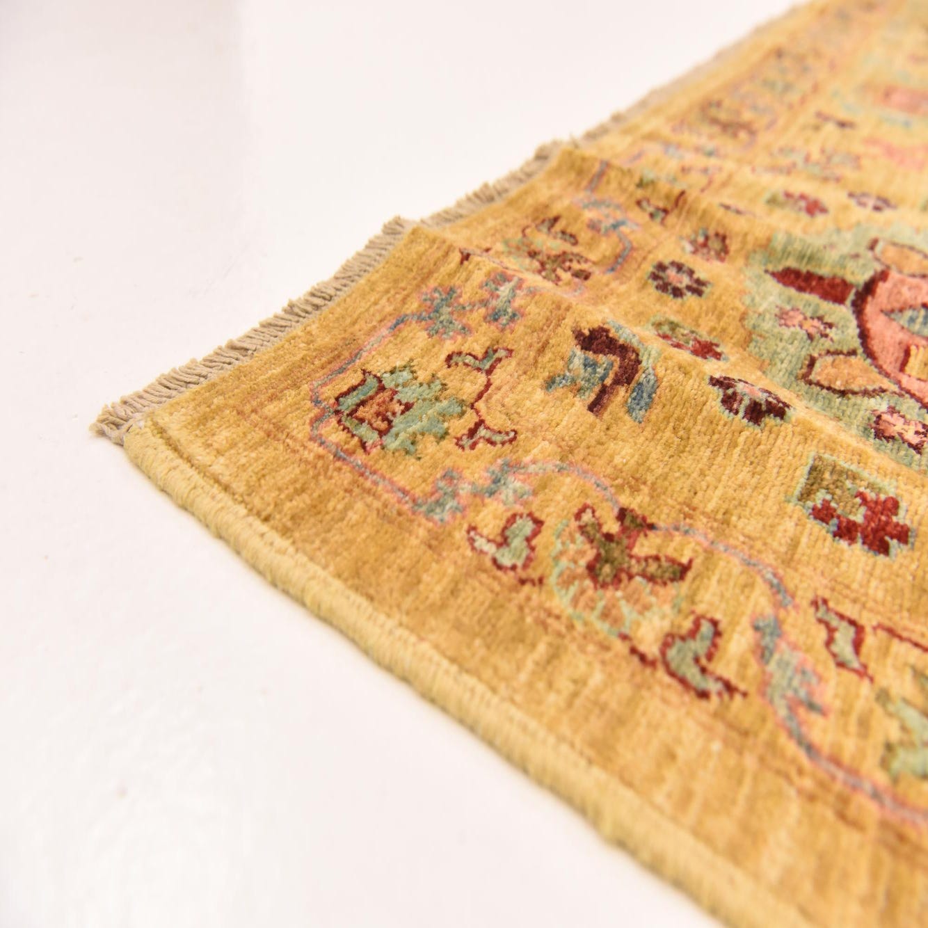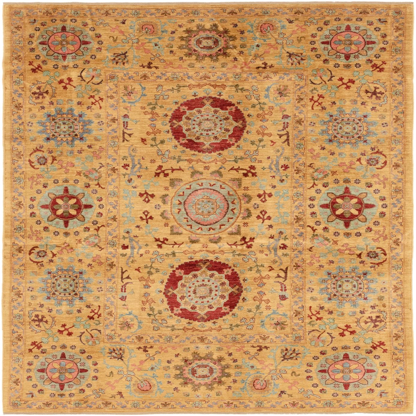 The Ariana Ziegler collection presents a meticulously hand-knotted rug, crafted from 100% hand-spun wool, offering both durability and a soft texture underfoot. This 6x9 piece is adorned with an intricate pattern, featuring a symphony of colors including gold, black, green, light blue, orange, and teal on a rich gold background.